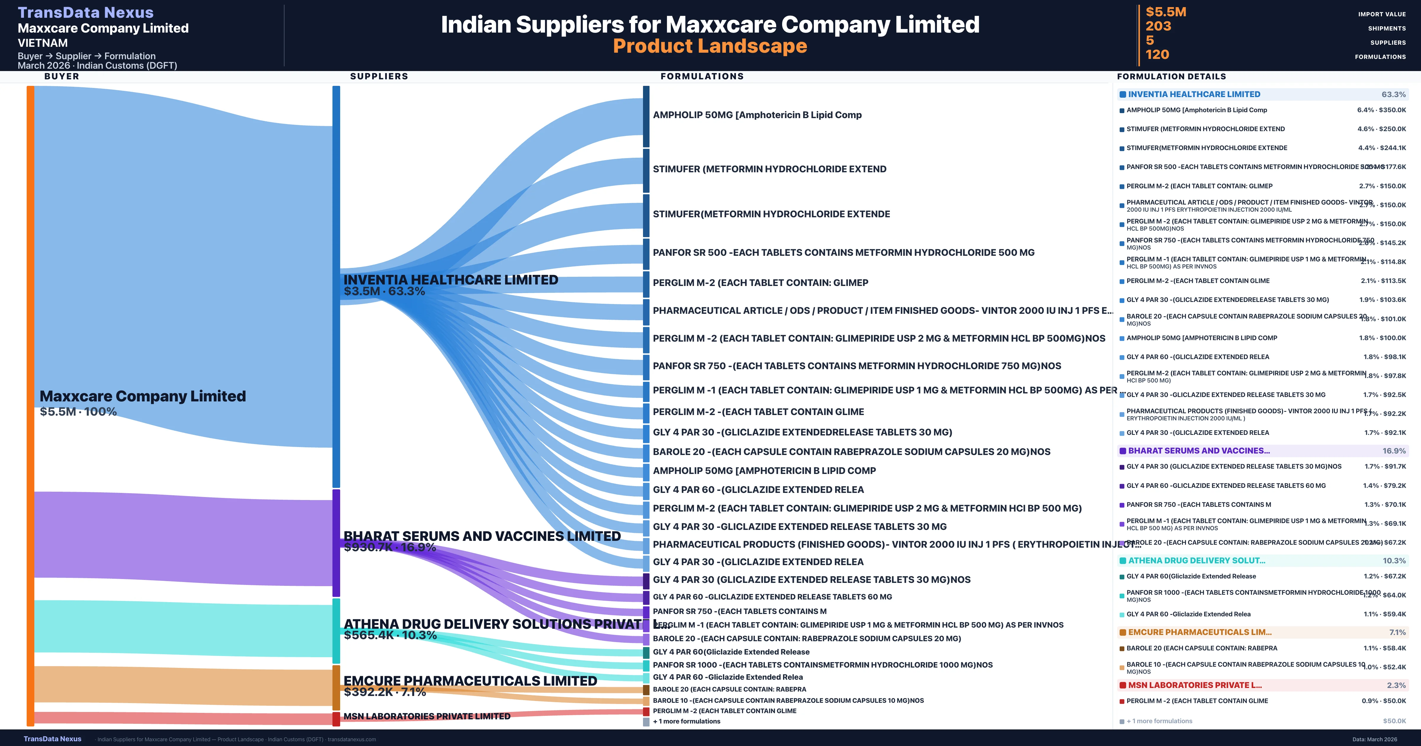 - 5.Supplier Verification: Maxxcare Company Limited sources from 5 verified Indian suppliers across 120 formulations, confirmed from customs records.
