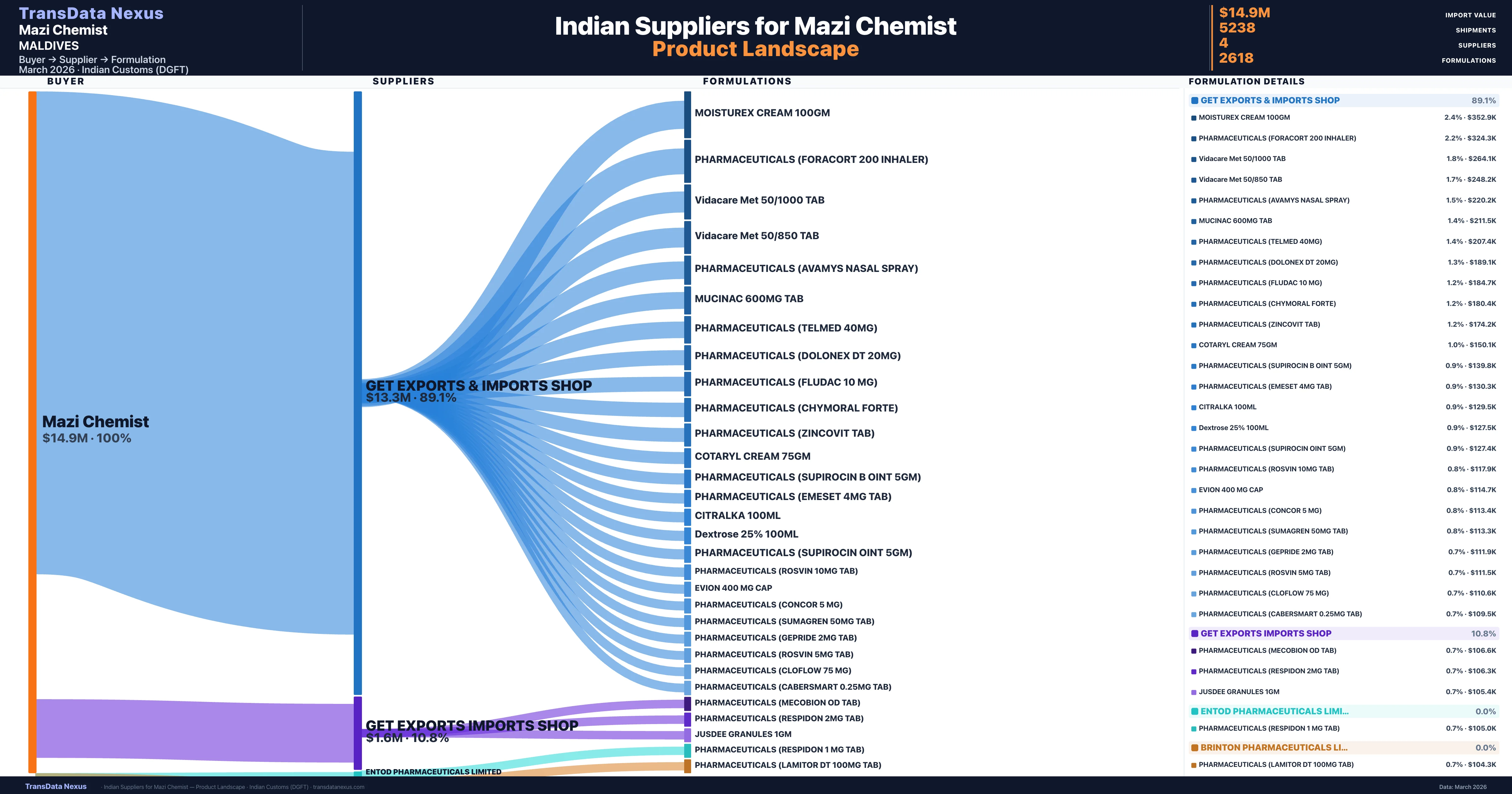 Mazi Chemist is a pharmaceutical importer based in Maldives with a total trade value of $496.1K across 3 products in 1 therapeutic categories. Based on 92 verified import shipments from Indian Customs (DGFT) records, the company actively imports across multiple product segments. Mazi Chemist sources from 4 verified Indian suppliers, with Get Exports & Imports Shop accounting for 89.1% of imports.