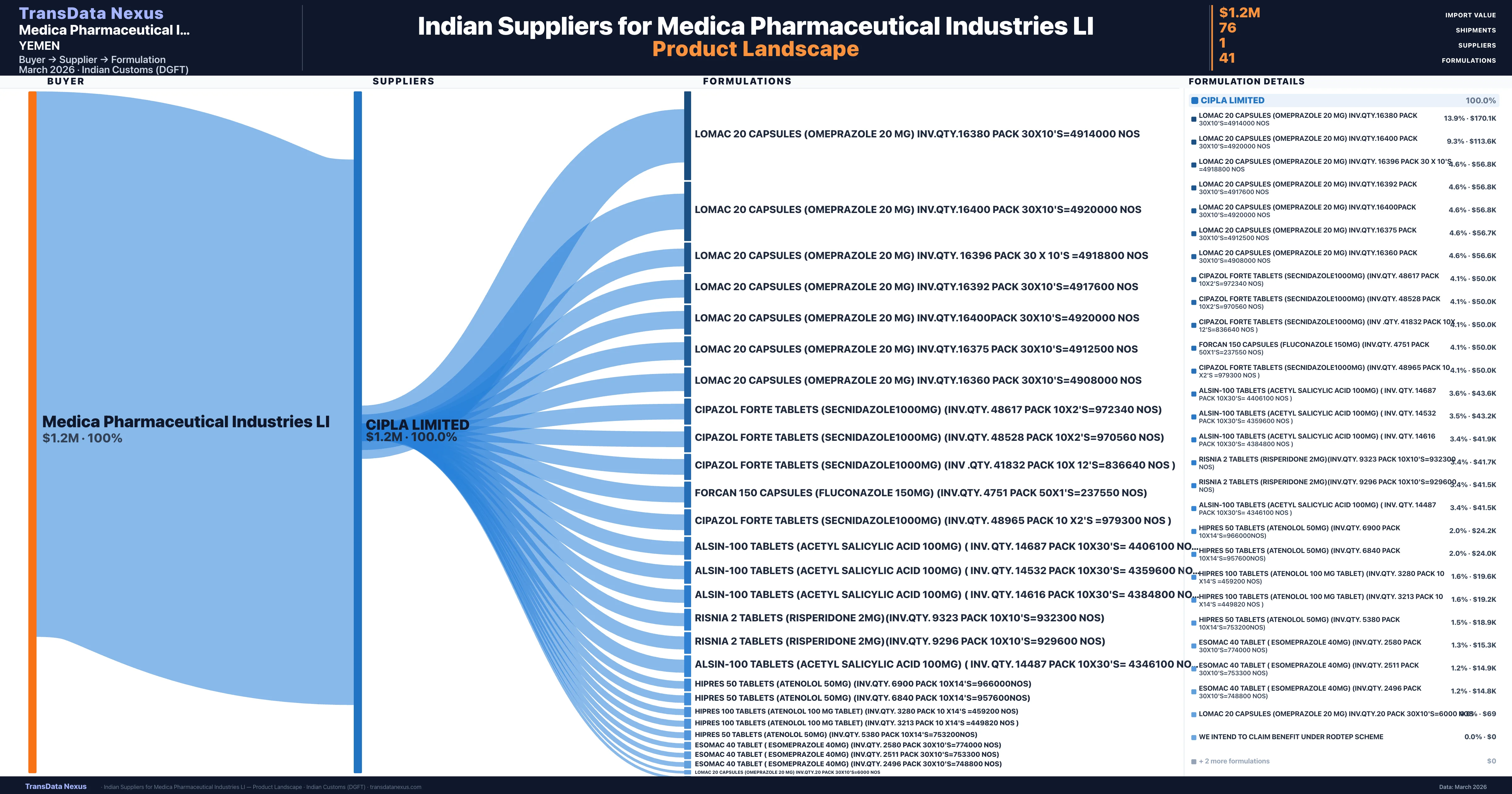 Medica Pharmaceutical Industries LI sources from 1 verified Indian supplier across 41 distinct formulations. The sourcing is highly concentrated β Cipla Limited accounts for 100.0% of total imports, indicating a strategic single-source relationship.