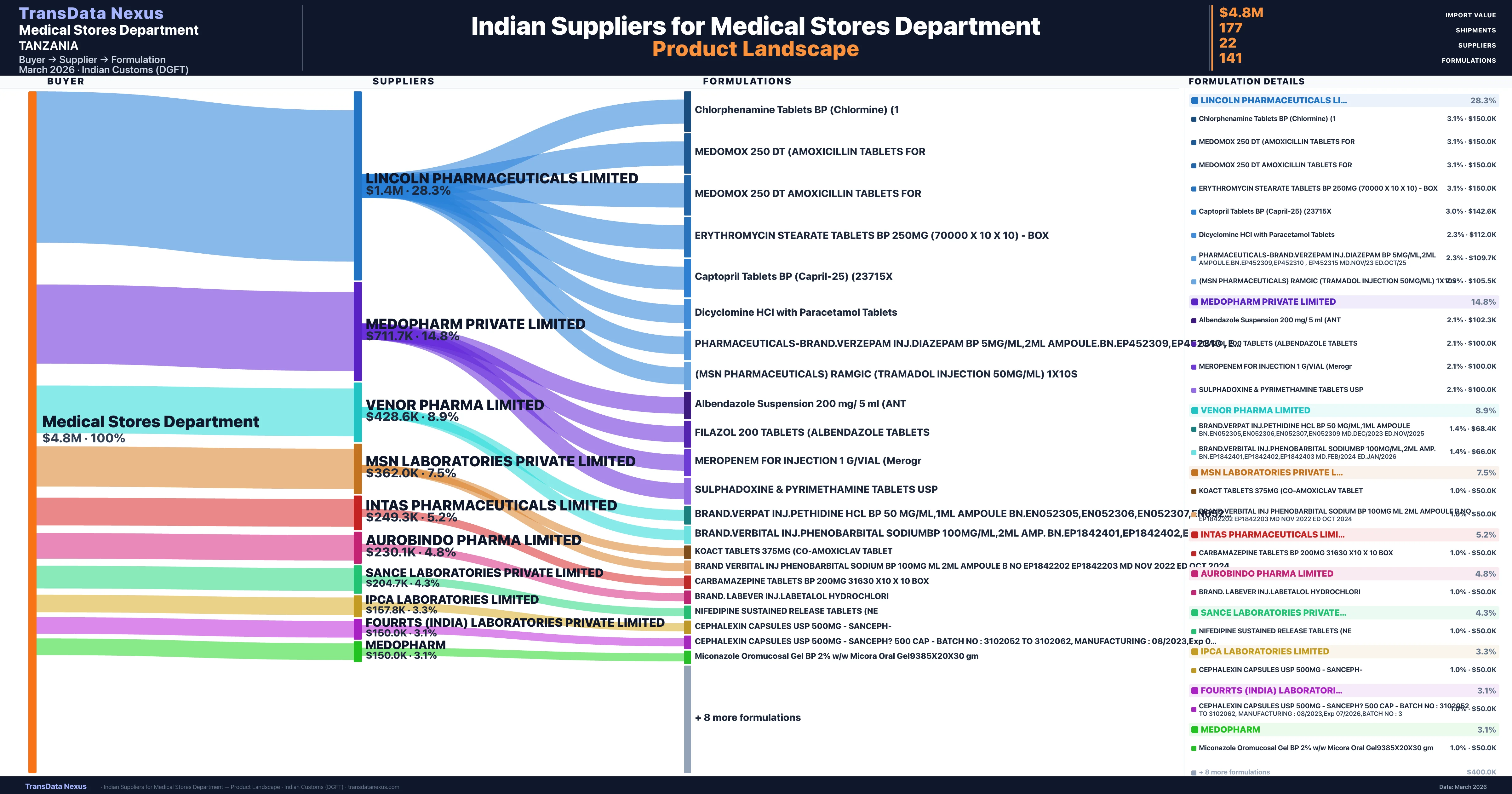 Medical Stores Department sources from 22 verified Indian suppliers. The primary supplier is Lincoln Pharmaceuticals Limited (28.3% of imports, $1.4M).