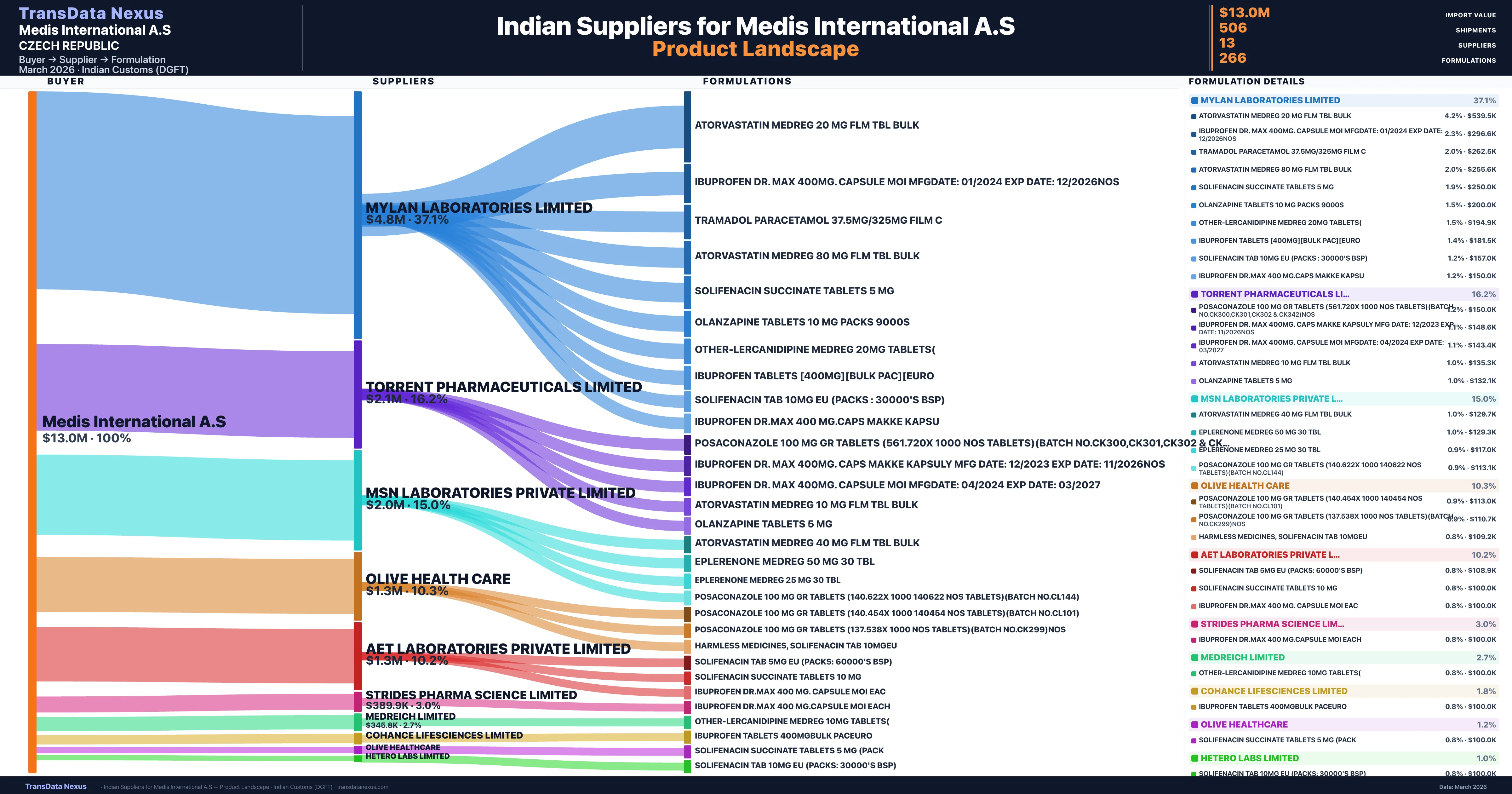 - 5.Supplier Verification: Medis International A.S sources from 13 verified Indian suppliers across 266 formulations, confirmed from customs records.