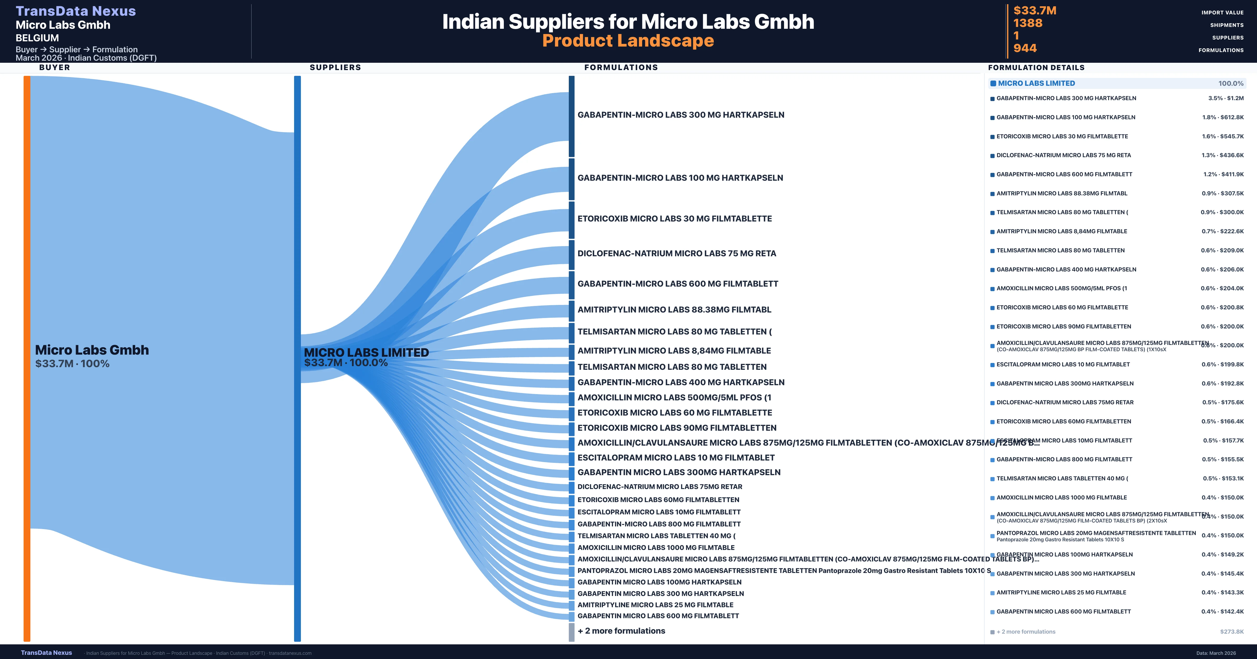 Micro Labs Gmbh sources from 1 verified Indian supplier across 944 distinct formulations. The sourcing is highly concentrated — Micro Labs Limited accounts for 100.0% of total imports, indicating a strategic single-source relationship.