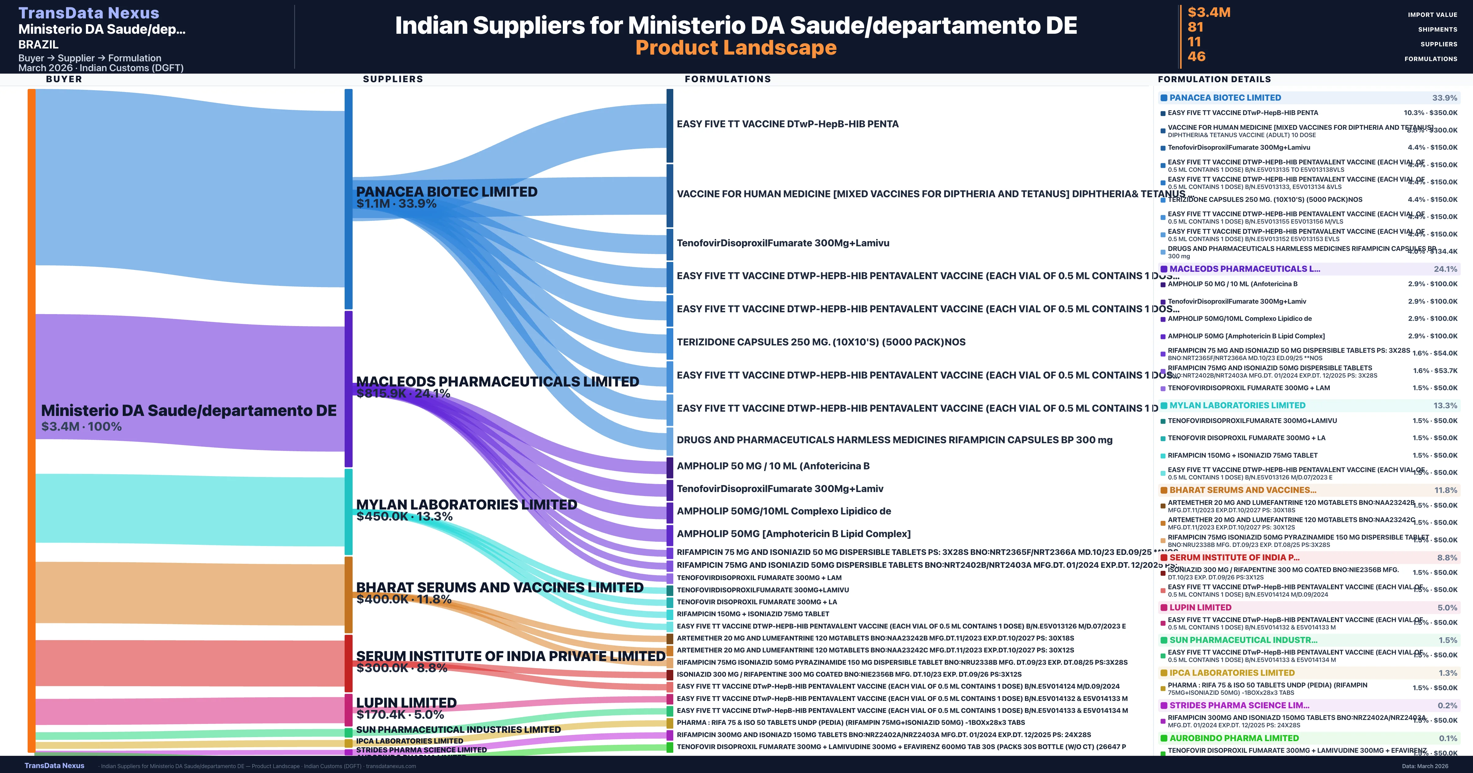 - 5.Supplier Verification: Ministerio DA Saude/departamento DE sources from 11 verified Indian suppliers across 46 formulations, confirmed from customs records.