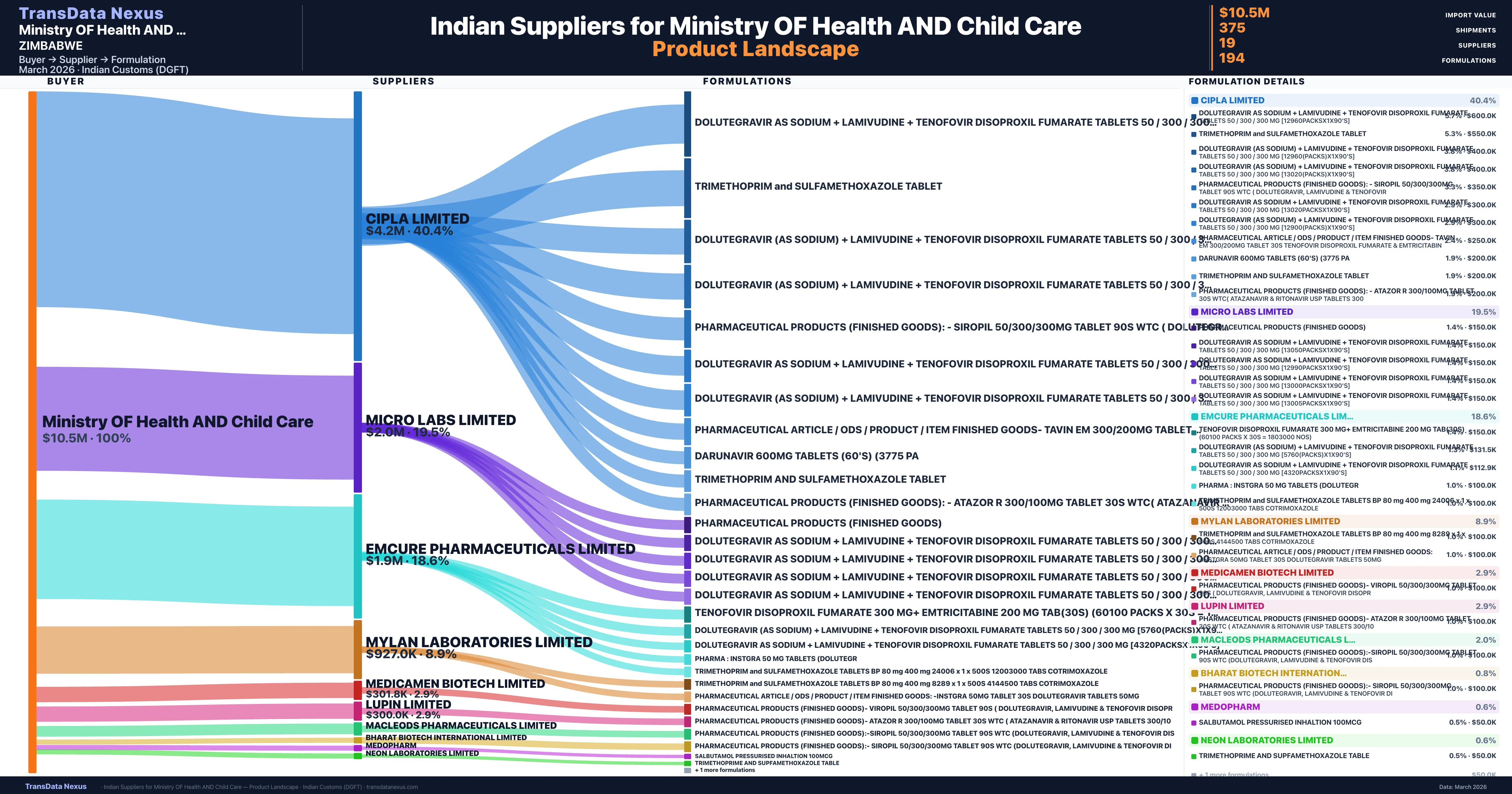 Ministry OF Health AND Child Care is a pharmaceutical importer based in Zimbabwe with a total trade value of $13.1M across 7 products in 2 therapeutic categories. Based on 262 verified import shipments from Indian Customs (DGFT) records, Ministry OF Health AND Child Care is the #1 buyer in 2 products including Trimethoprim, Sulfamethoxazole. Ministry OF Health AND Child Care sources from 19 verified Indian suppliers, with Cipla Limited accounting for 40.4% of imports.