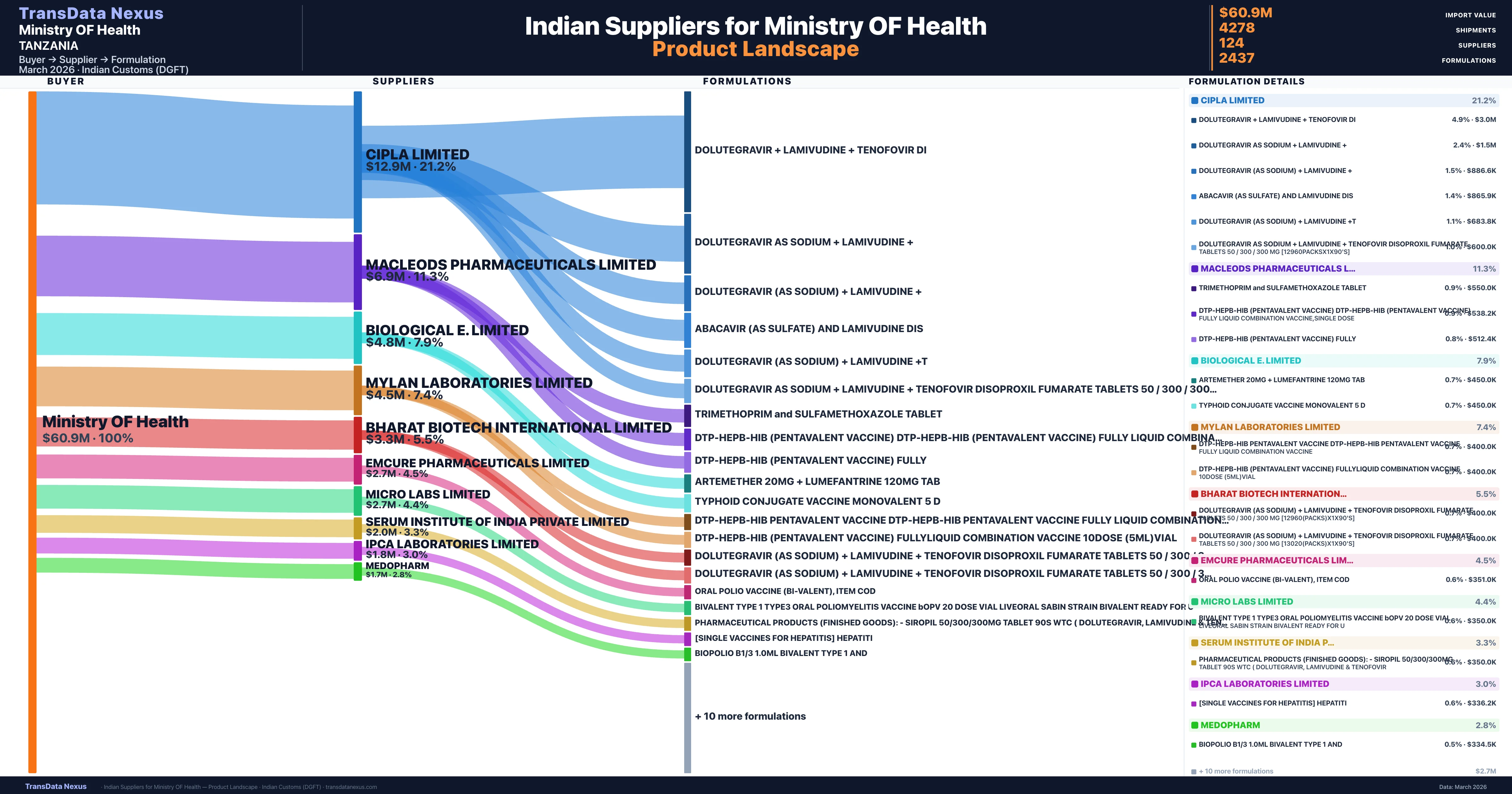 Ministry OF Health sources from 124 verified Indian suppliers. The primary supplier is Cipla Limited (21.2% of imports, $12.9M).