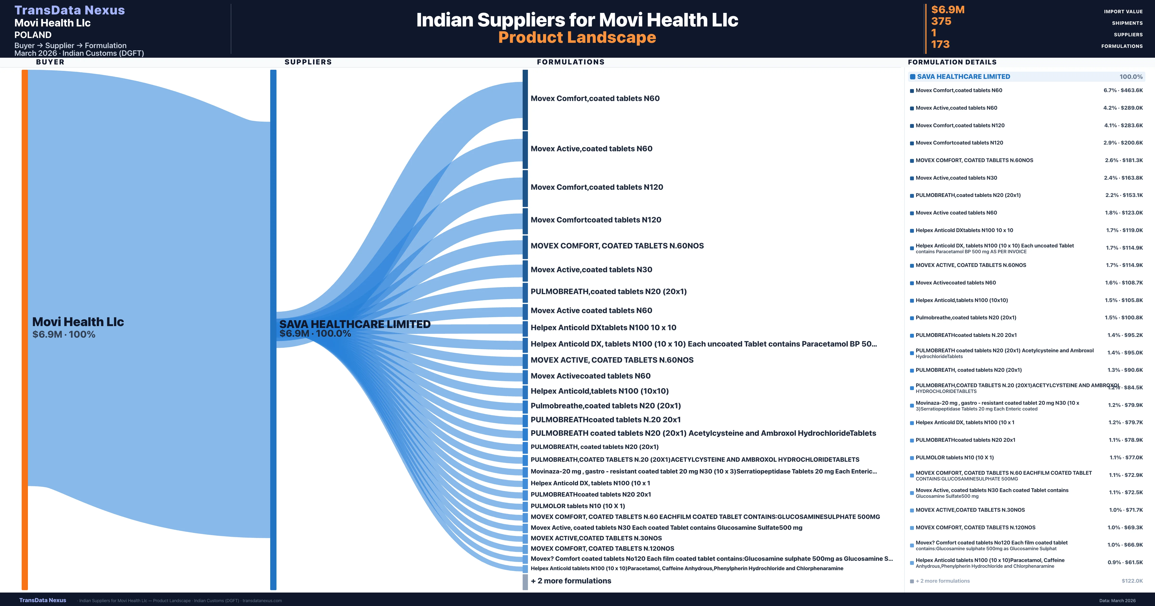 - 5.Supplier Verification: Movi Health Llc sources from 1 verified Indian suppliers across 173 formulations, confirmed from customs records.