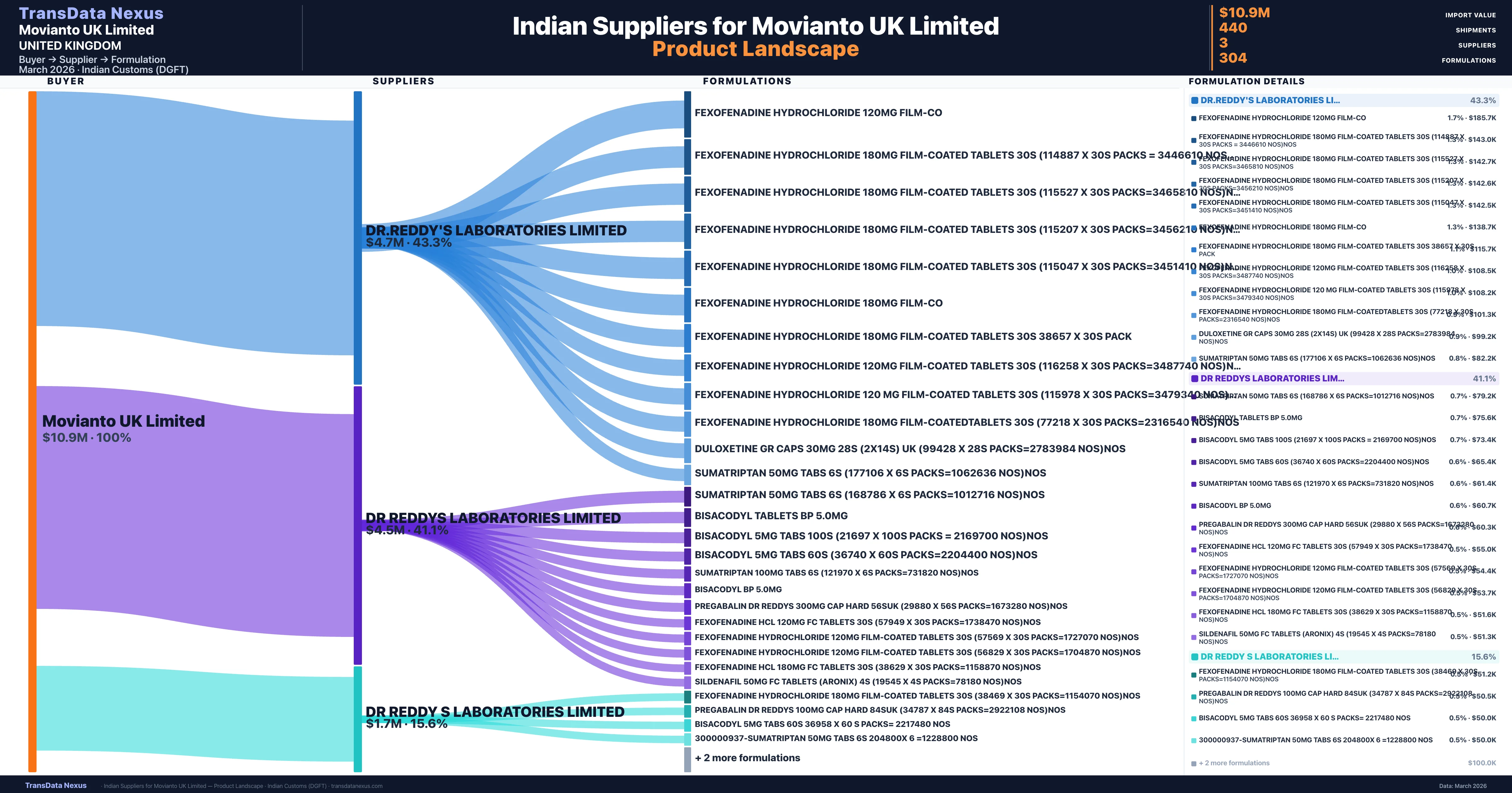 - 5.Supplier Verification: Movianto UK Limited sources from 3 verified Indian suppliers across 304 formulations, confirmed from customs records.