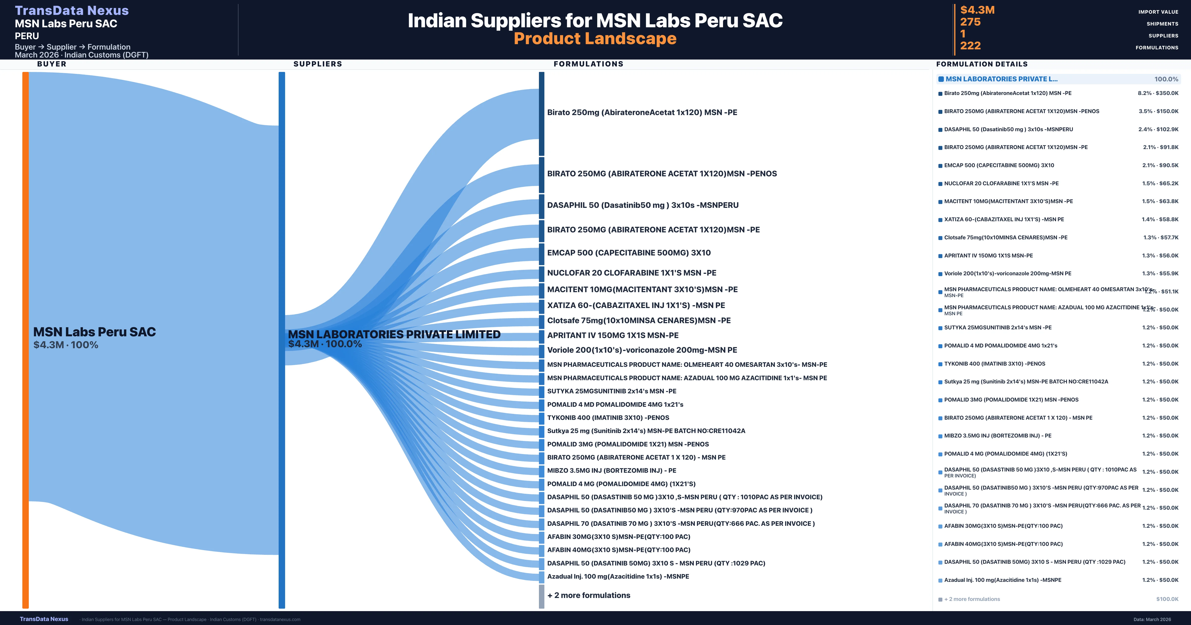 - 5.Supplier Verification: MSN Labs Peru SAC sources from 1 verified Indian suppliers across 222 formulations, confirmed from customs records.