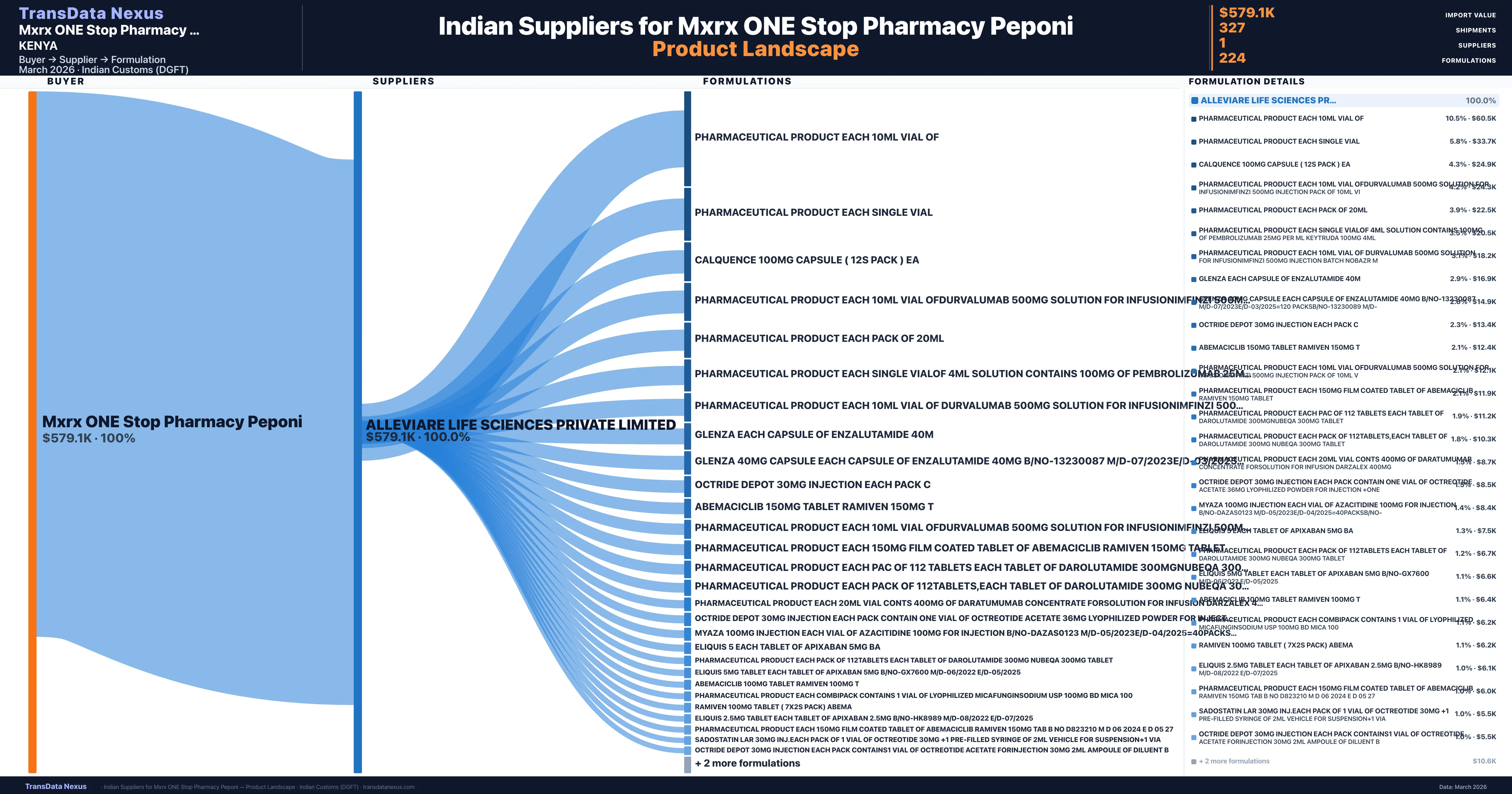 Mxrx ONE Stop Pharmacy Peponi sources from 1 verified Indian supplier across 224 distinct formulations. The sourcing is highly concentrated β Alleviare Life Sciences Private Limited accounts for 100.0% of total imports, indicating a strategic single-source relationship.