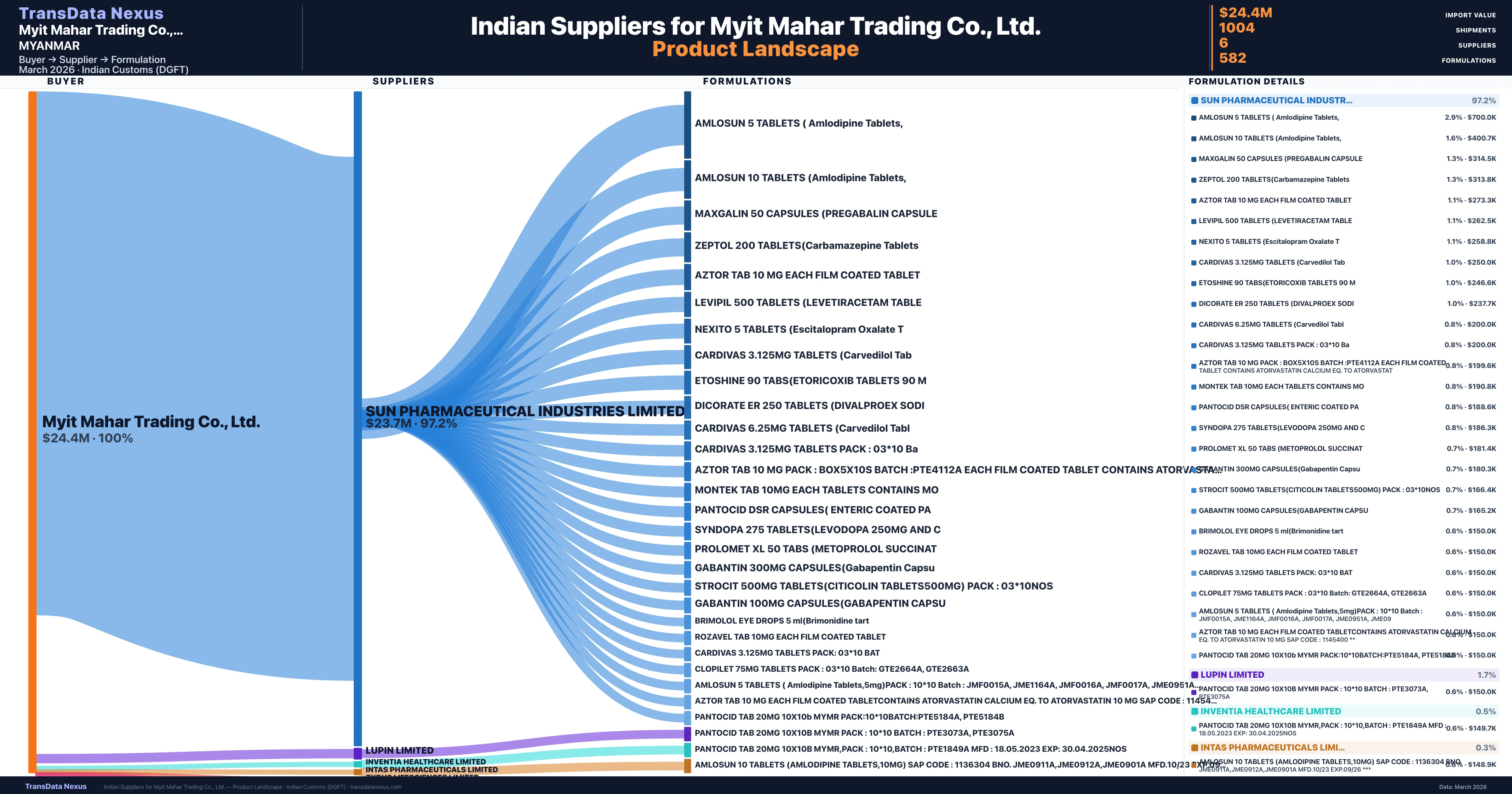 Myit Mahar Trading Co., Ltd. sources from 6 verified Indian suppliers across 582 distinct formulations. The sourcing is highly concentrated — Sun Pharmaceutical Industries Limited accounts for 97.2% of total imports, indicating a strategic single-source relationship.