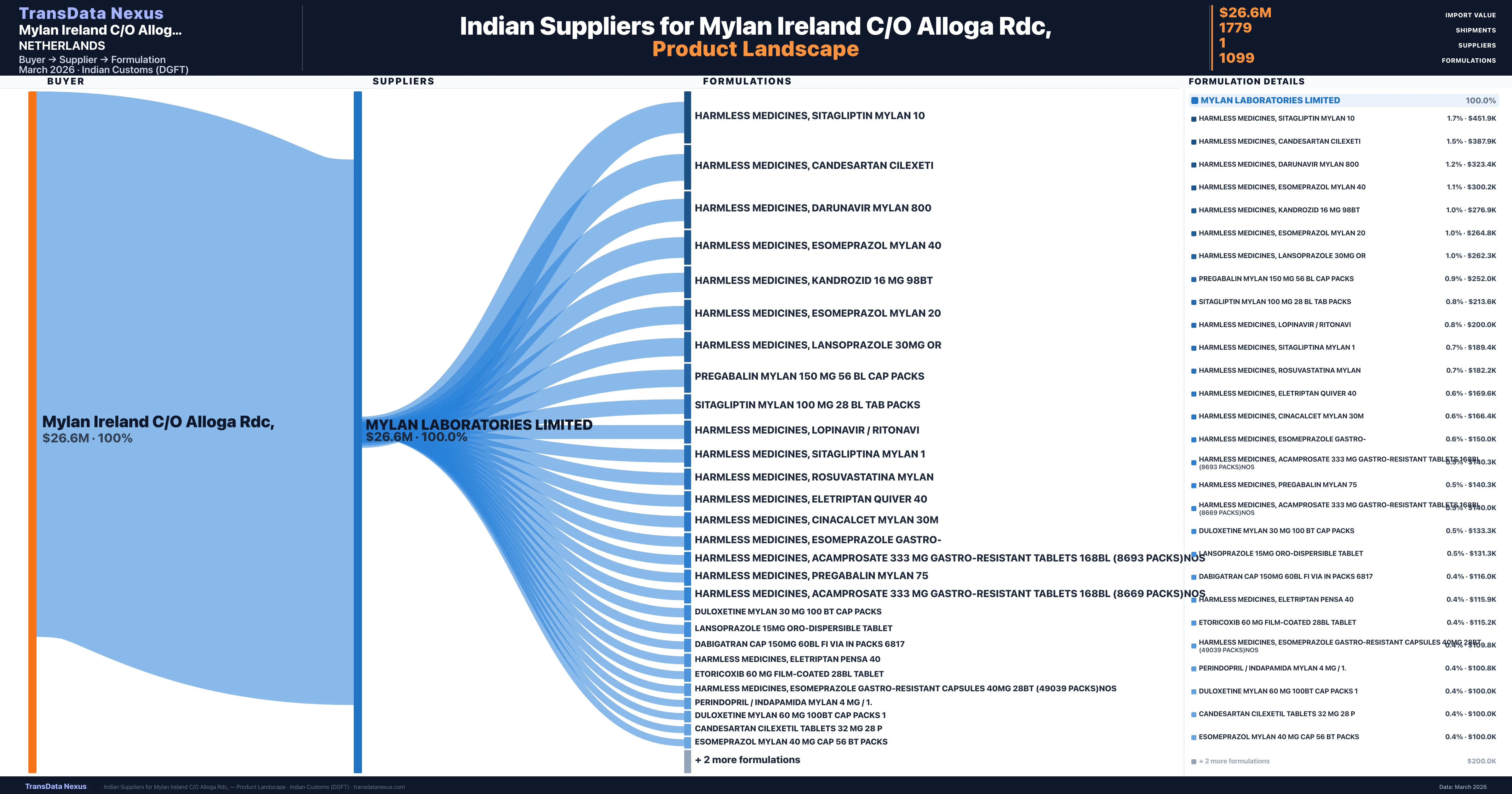 Mylan Ireland C/O Alloga Rdc, sources from 1 verified Indian supplier across 1,099 distinct formulations. The sourcing is highly concentrated — Mylan Laboratories Limited accounts for 100.0% of total imports, indicating a strategic single-source relationship.
