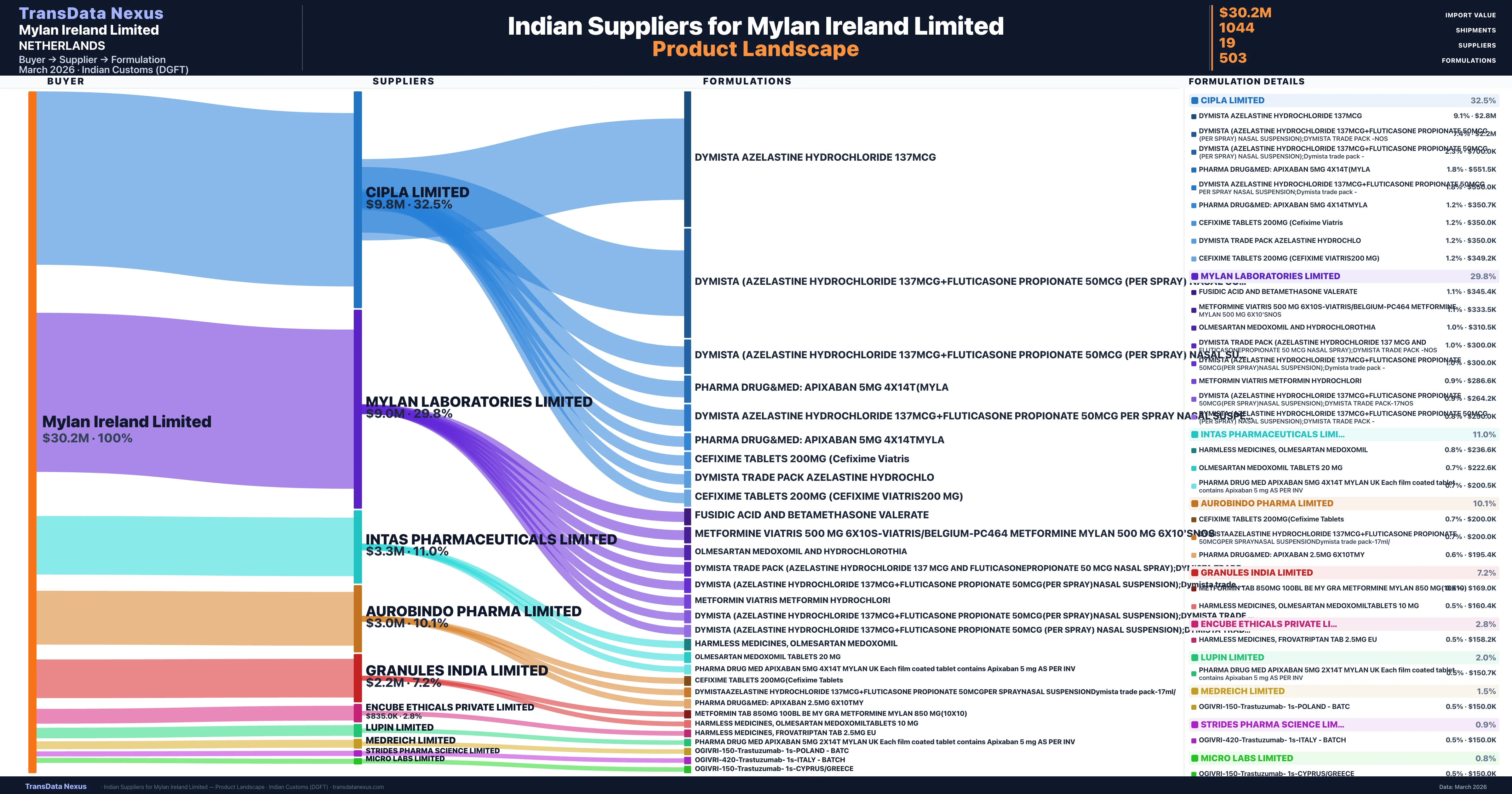 Mylan Ireland Limited sources from 19 verified Indian suppliers. The primary supplier is Cipla Limited (32.5% of imports, $9.8M).