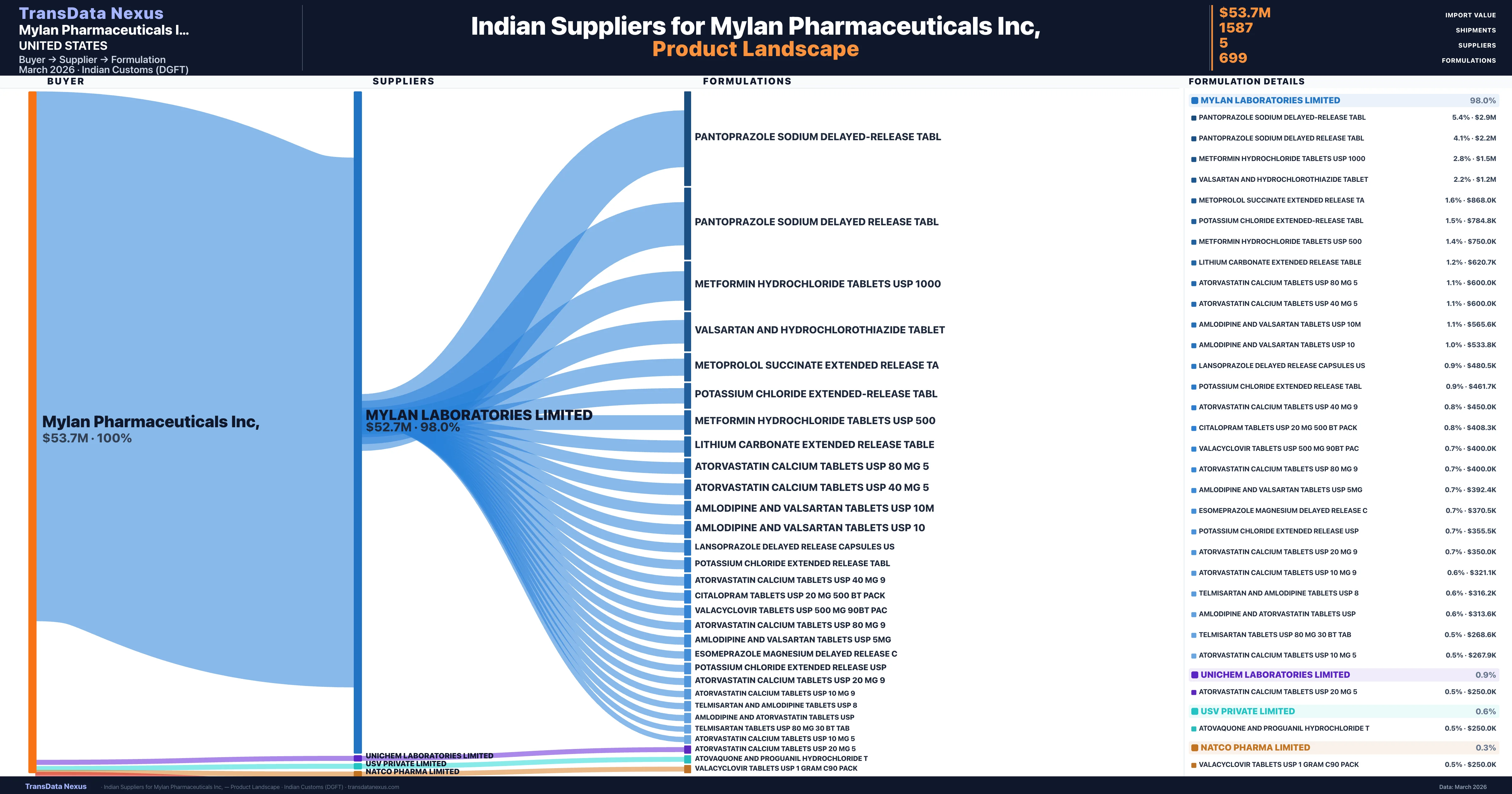 - 5.Supplier Verification: Mylan Pharmaceuticals Inc, sources from 5 verified Indian suppliers across 699 formulations, confirmed from customs records.