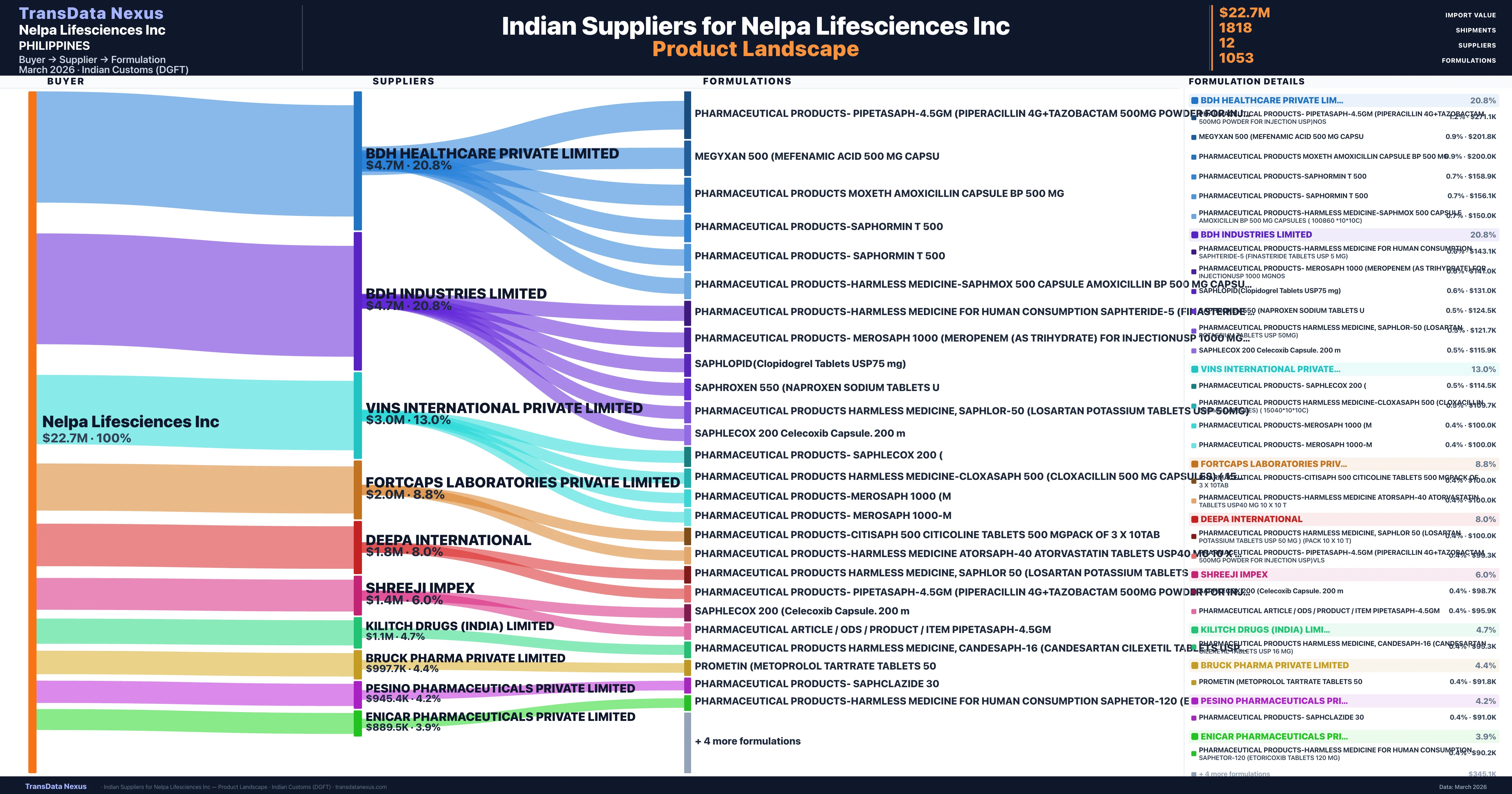 Nelpa Lifesciences Inc is a pharmaceutical importer based in Philippines with a total trade value of $13.3M across 11 products in 7 therapeutic categories. Based on 284 verified import shipments from Indian Customs (DGFT) records, the company actively imports across multiple product segments. Nelpa Lifesciences Inc sources from 12 verified Indian suppliers, with Bdh Healthcare Private Limited accounting for 20.8% of imports.