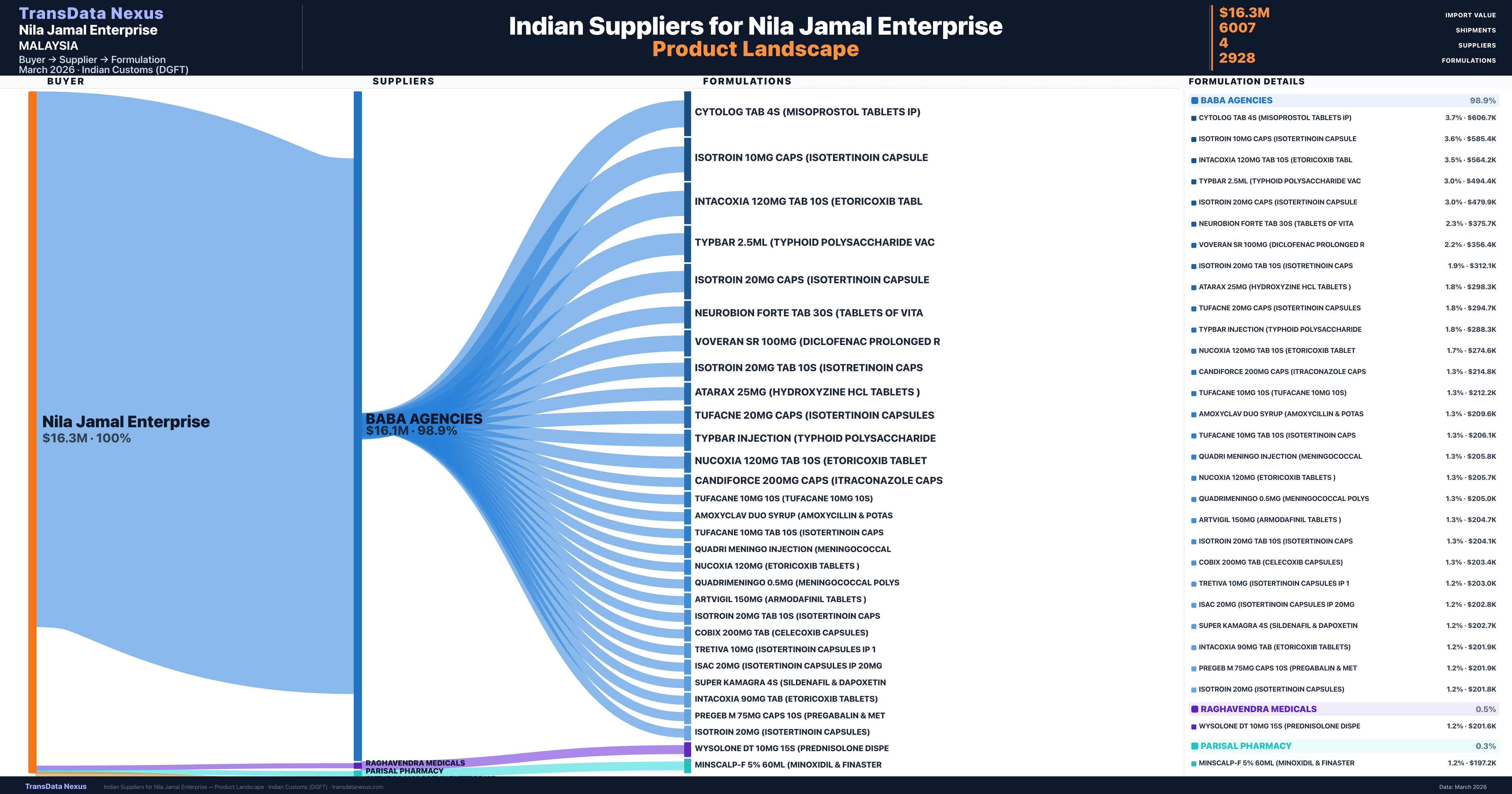 Nila Jamal Enterprise sources from 4 verified Indian suppliers across 2,928 distinct formulations. The sourcing is highly concentrated — Baba Agencies accounts for 98.9% of total imports, indicating a strategic single-source relationship.