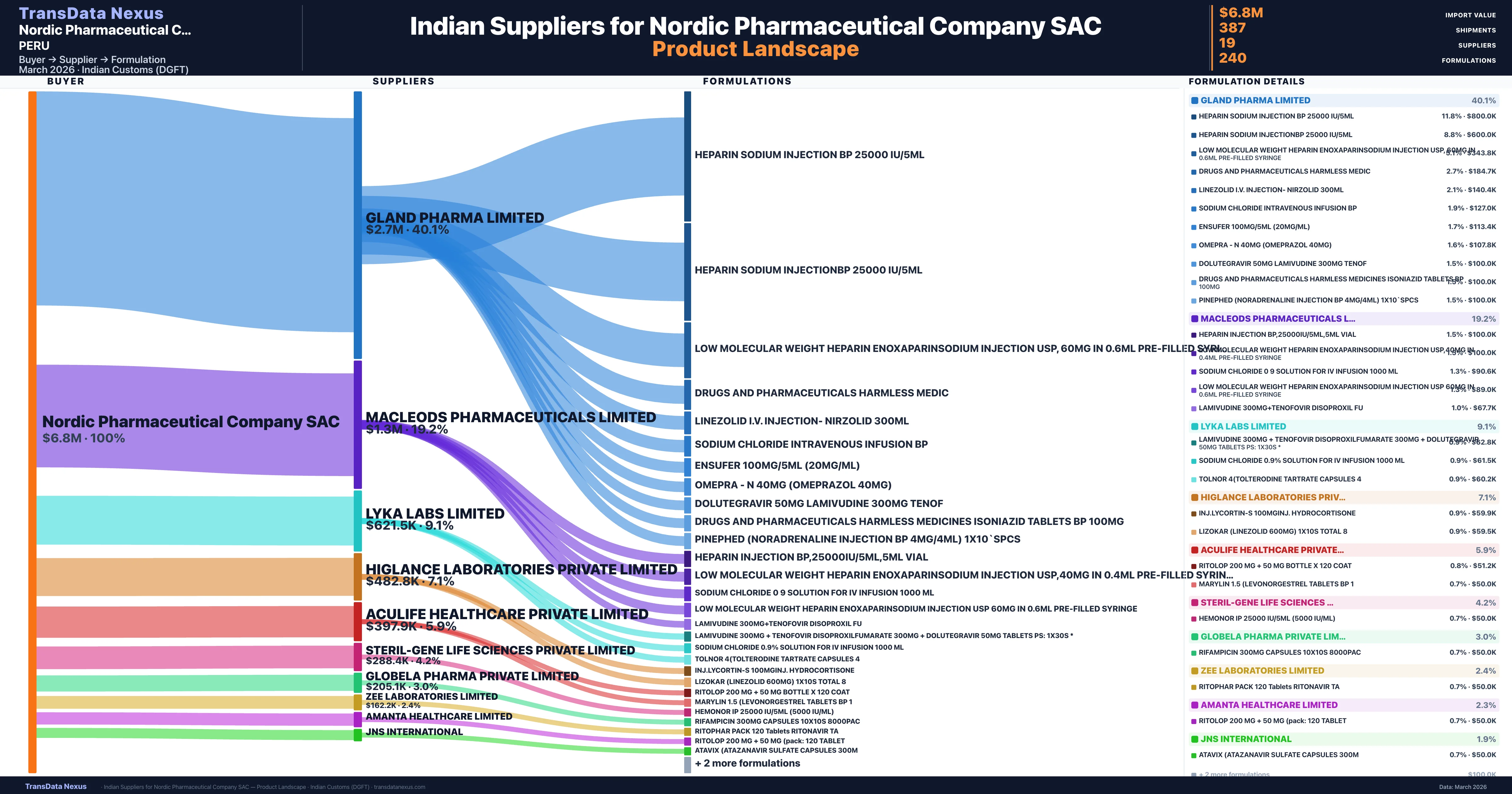 Nordic Pharmaceutical Company SAC sources from 19 verified Indian suppliers. The primary supplier is Gland Pharma Limited (40.1% of imports, $2.7M).