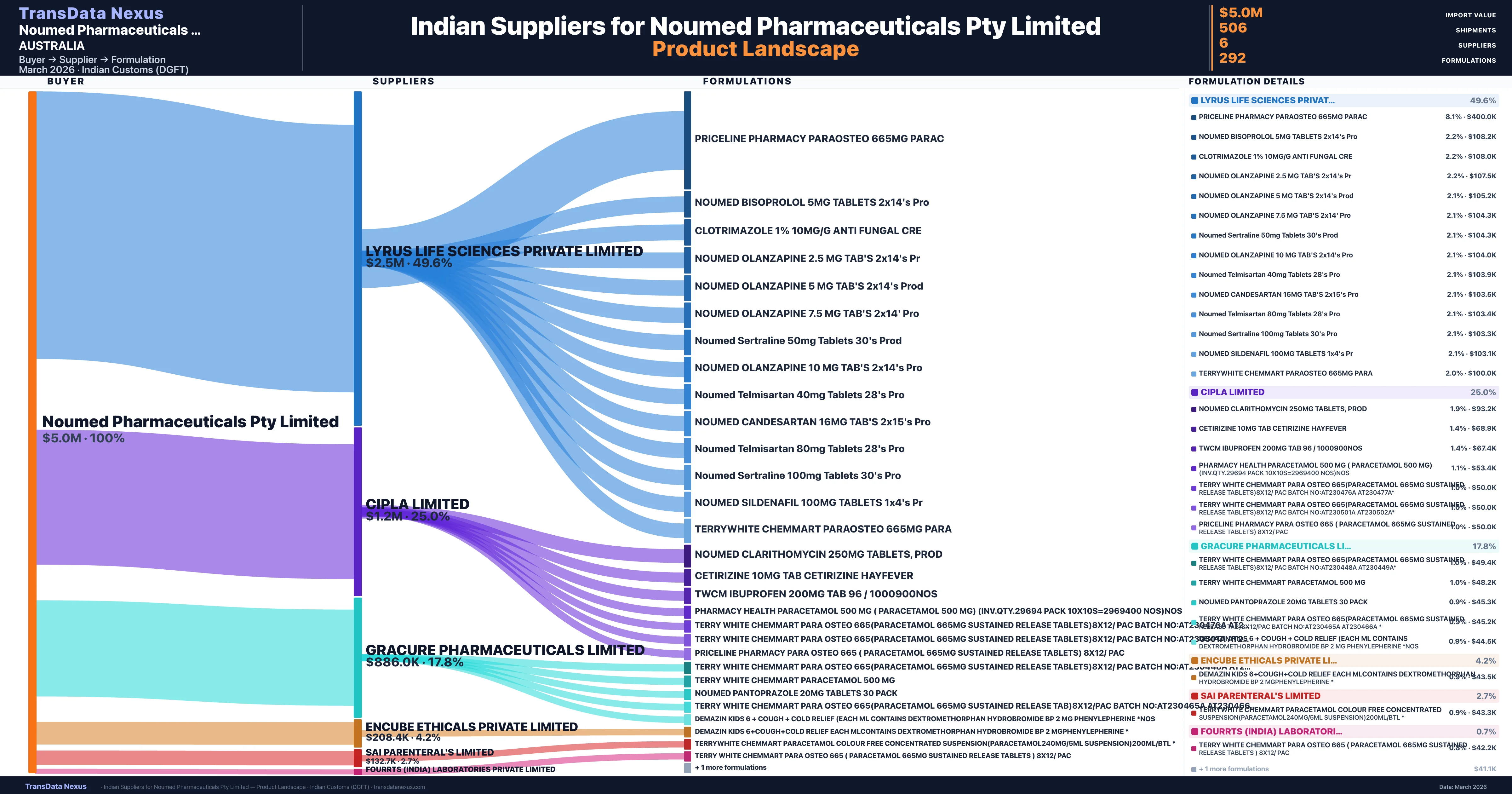 - 5.Supplier Verification: Noumed Pharmaceuticals Pty Limited sources from 6 verified Indian suppliers across 292 formulations, confirmed from customs records.