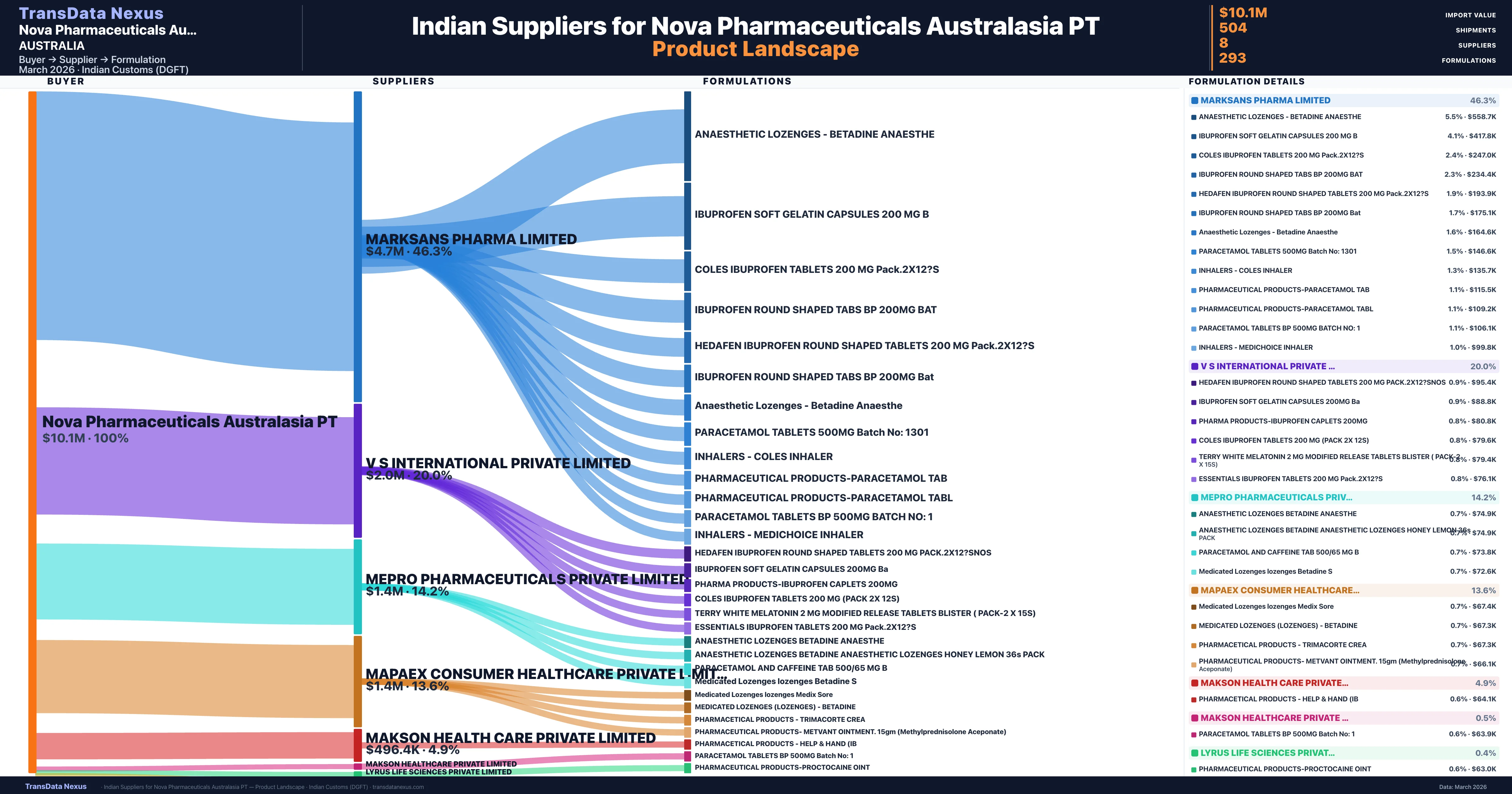 Nova Pharmaceuticals Australasia PT sources from 8 verified Indian suppliers. The primary supplier is Marksans Pharma Limited (46.3% of imports, $4.7M).