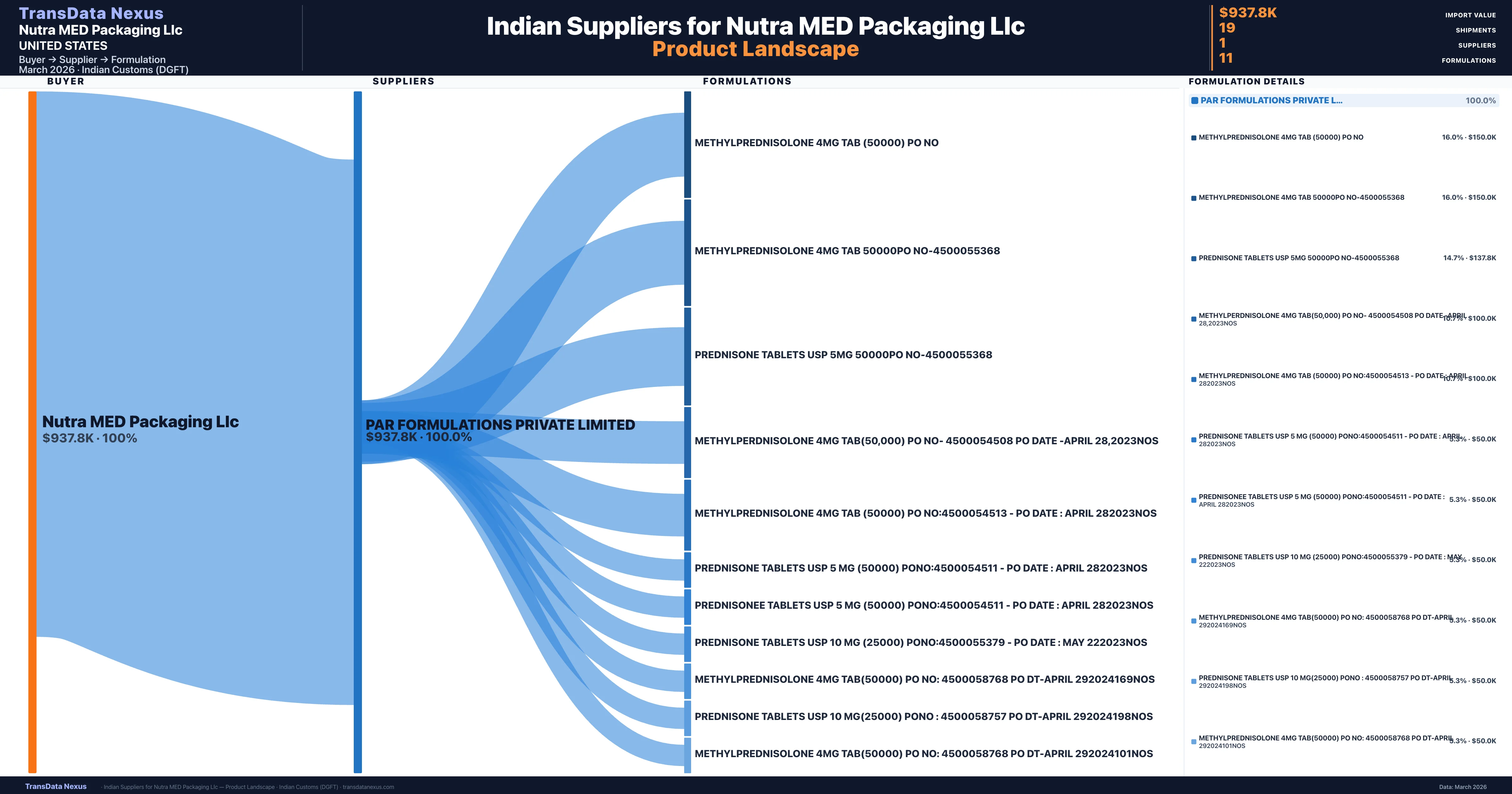 Nutra MED Packaging Llc sources from 1 verified Indian supplier across 11 distinct formulations. The sourcing is highly concentrated β Par Formulations Private Limited accounts for 100.0% of total imports, indicating a strategic single-source relationship.
