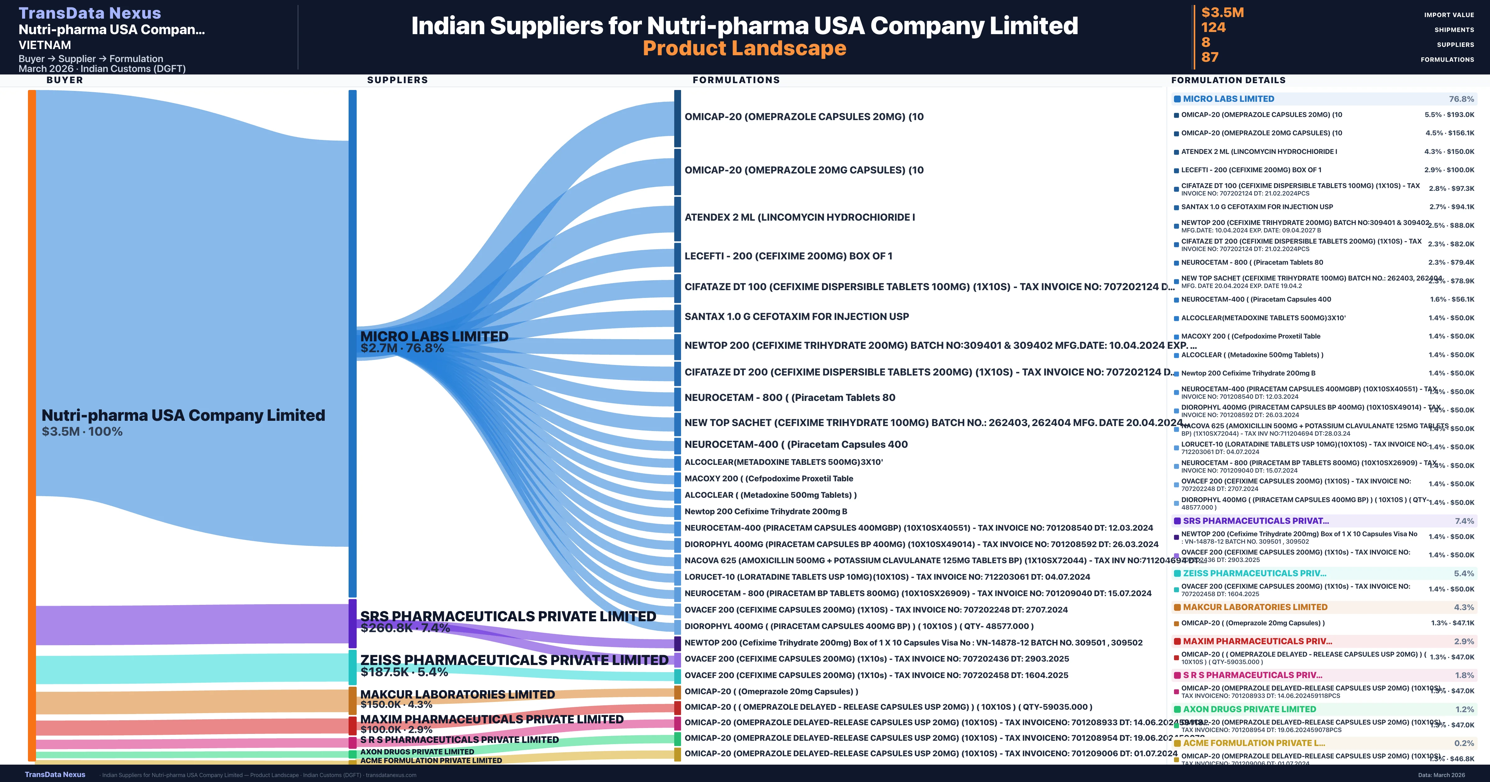 Nutri-pharma USA Company Limited is a pharmaceutical importer based in Vietnam with a total trade value of $983.1K across 2 products in 2 therapeutic categories. Based on 21 verified import shipments from Indian Customs (DGFT) records, the company actively imports across multiple product segments. Nutri-pharma USA Company Limited sources from 8 verified Indian suppliers, with Micro Labs Limited accounting for 76.8% of imports.