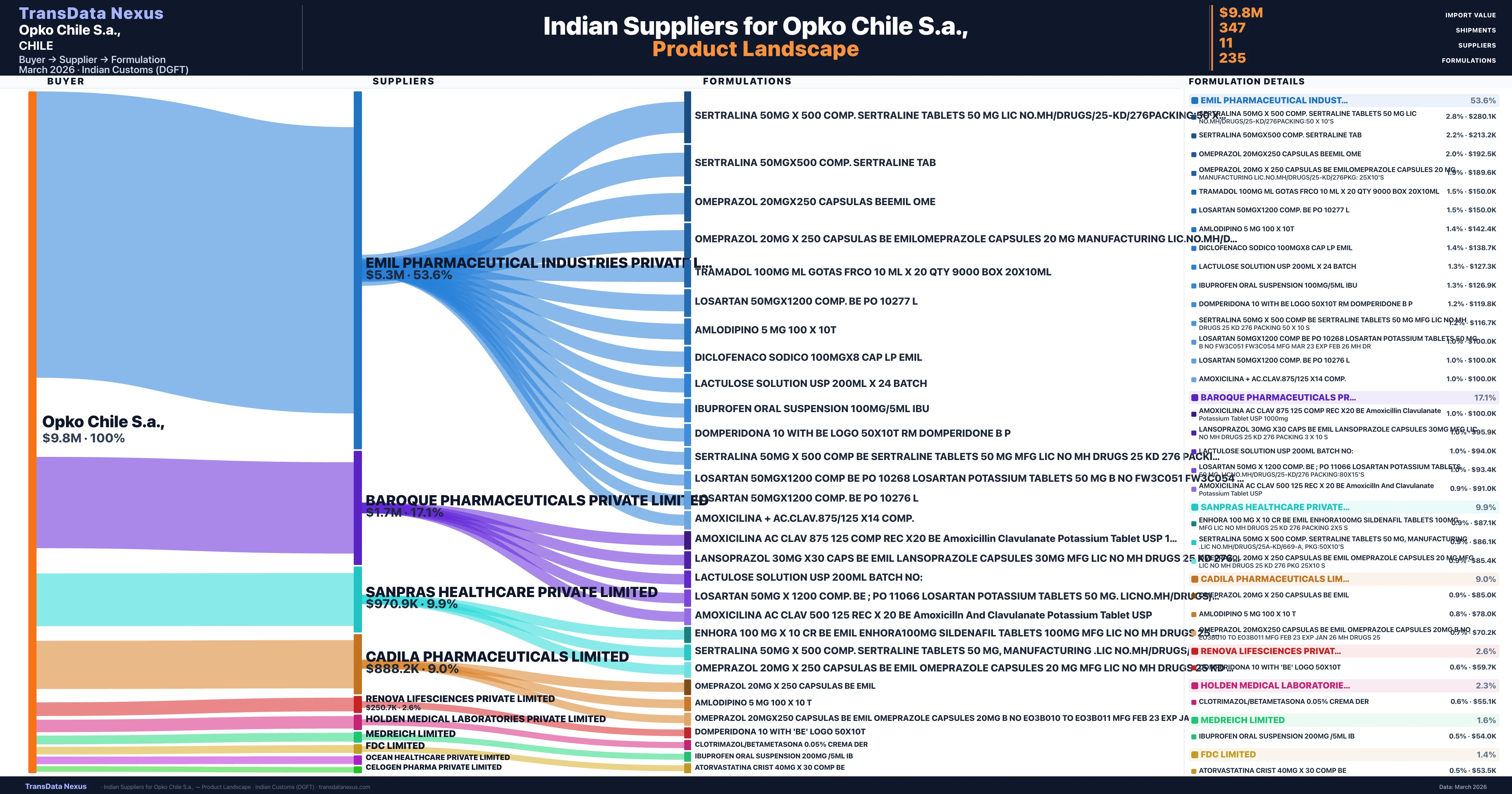 Opko Chile S.a., sources from 11 verified Indian suppliers across 235 distinct formulations. The supply base is diversified across 11 suppliers, reducing single-source dependency risk.