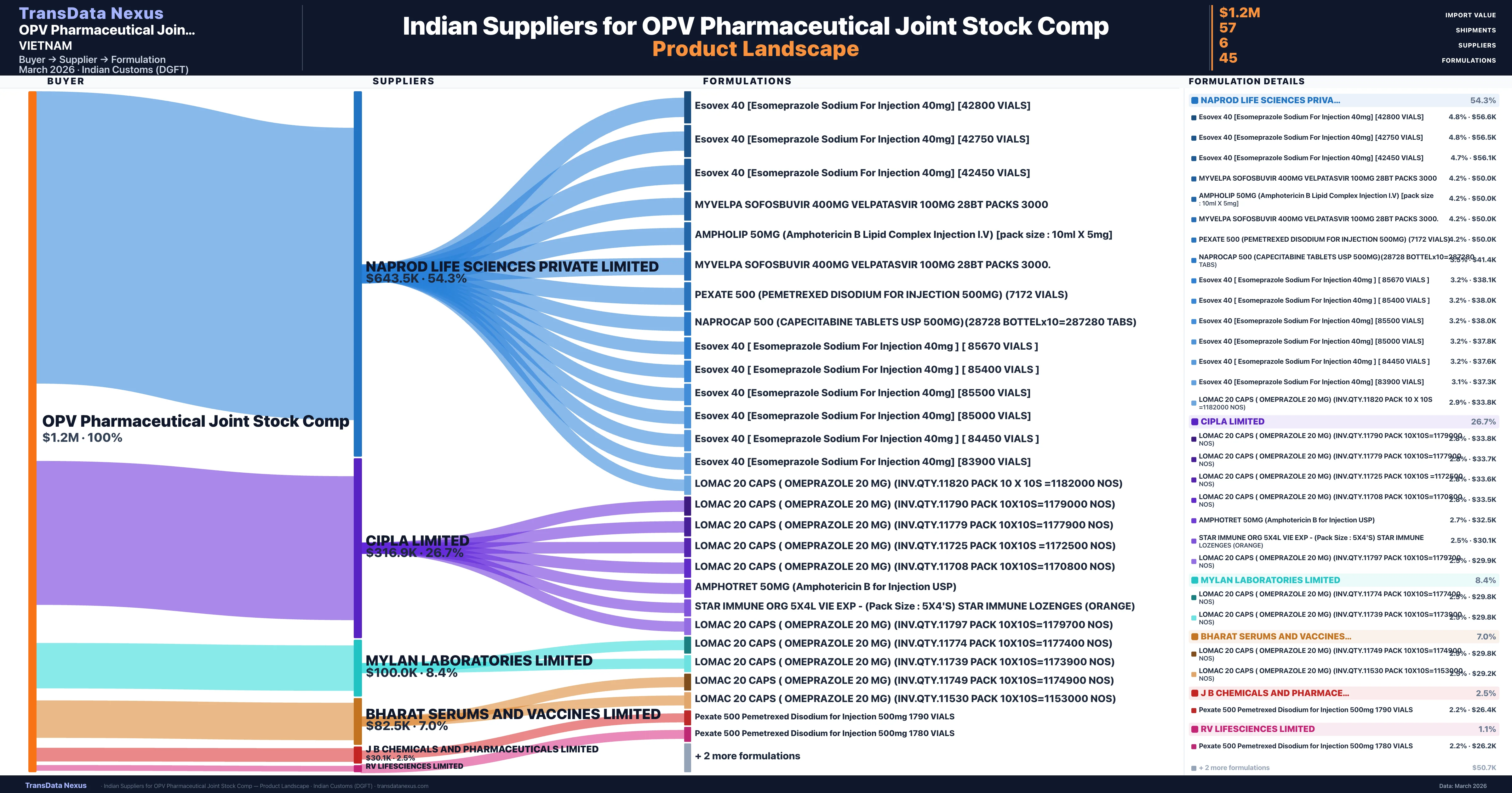 OPV Pharmaceutical Joint Stock Comp is a pharmaceutical importer based in Vietnam with a total trade value of $304.9K across 2 products in 2 therapeutic categories. Based on 7 verified import shipments from Indian Customs (DGFT) records, the company actively imports across multiple product segments. OPV Pharmaceutical Joint Stock Comp sources from 6 verified Indian suppliers, with Naprod Life Sciences Private Limited accounting for 54.3% of imports.