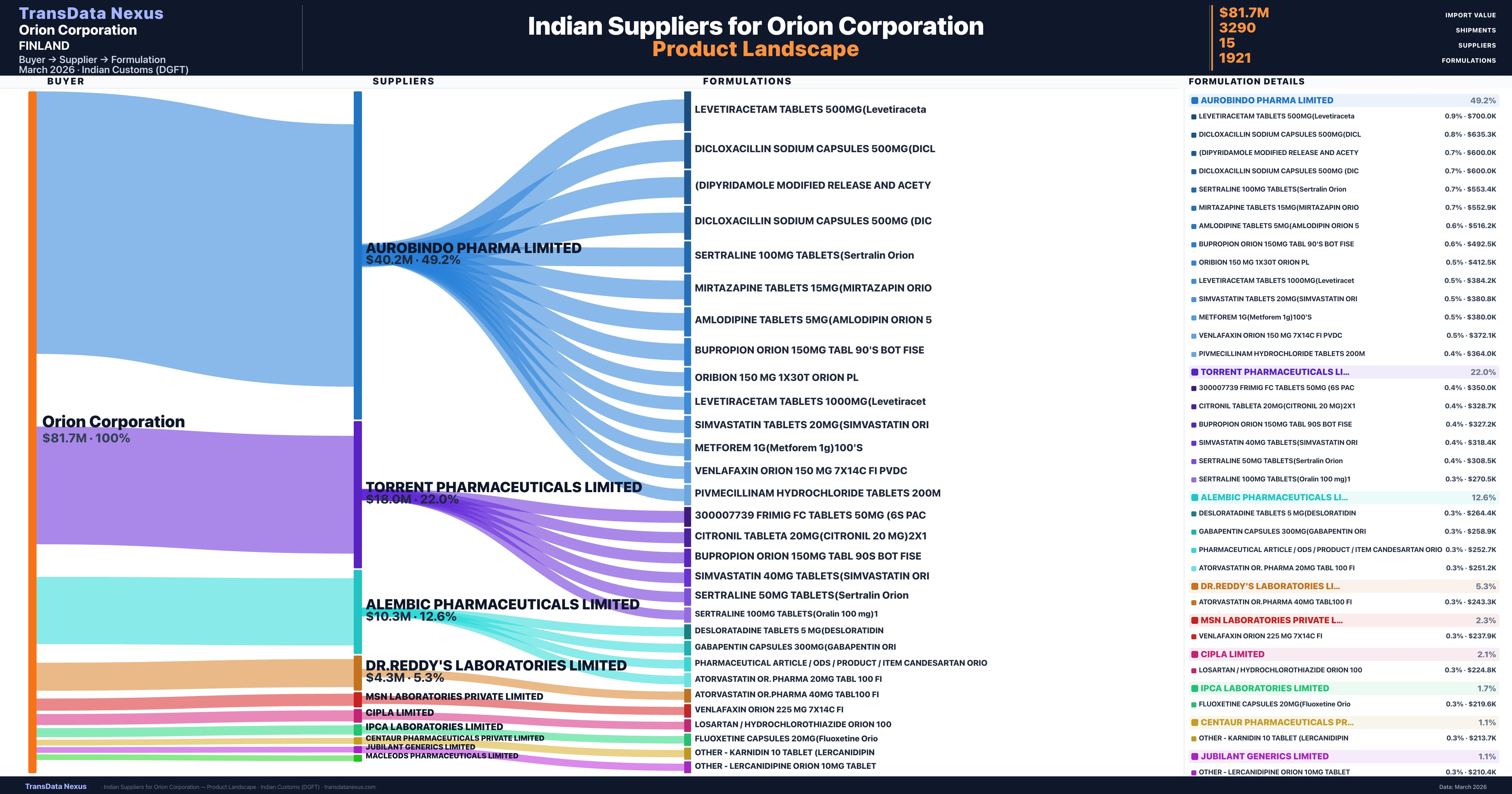 Orion Corporation imports 1,921 distinct pharmaceutical formulations. Showing top 15 by value. For full formulation-level data, contact TransData Nexus.