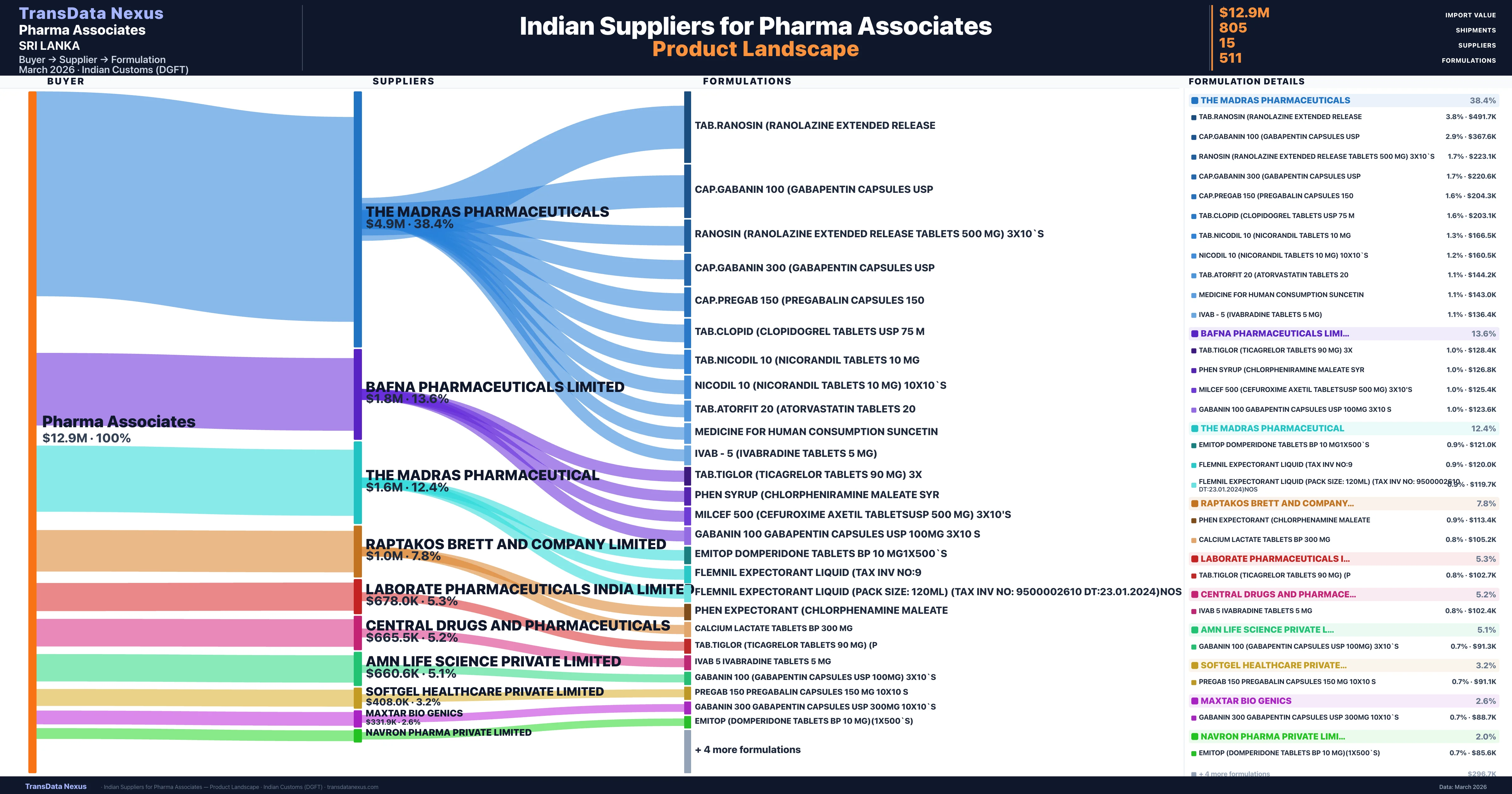 Pharma Associates is a pharmaceutical importer based in Sri Lanka with a total trade value of $365.7K across 2 products in 2 therapeutic categories. Based on 12 verified import shipments from Indian Customs (DGFT) records, the company actively imports across multiple product segments. Pharma Associates sources from 15 verified Indian suppliers, with The Madras Pharmaceuticals accounting for 38.4% of imports.