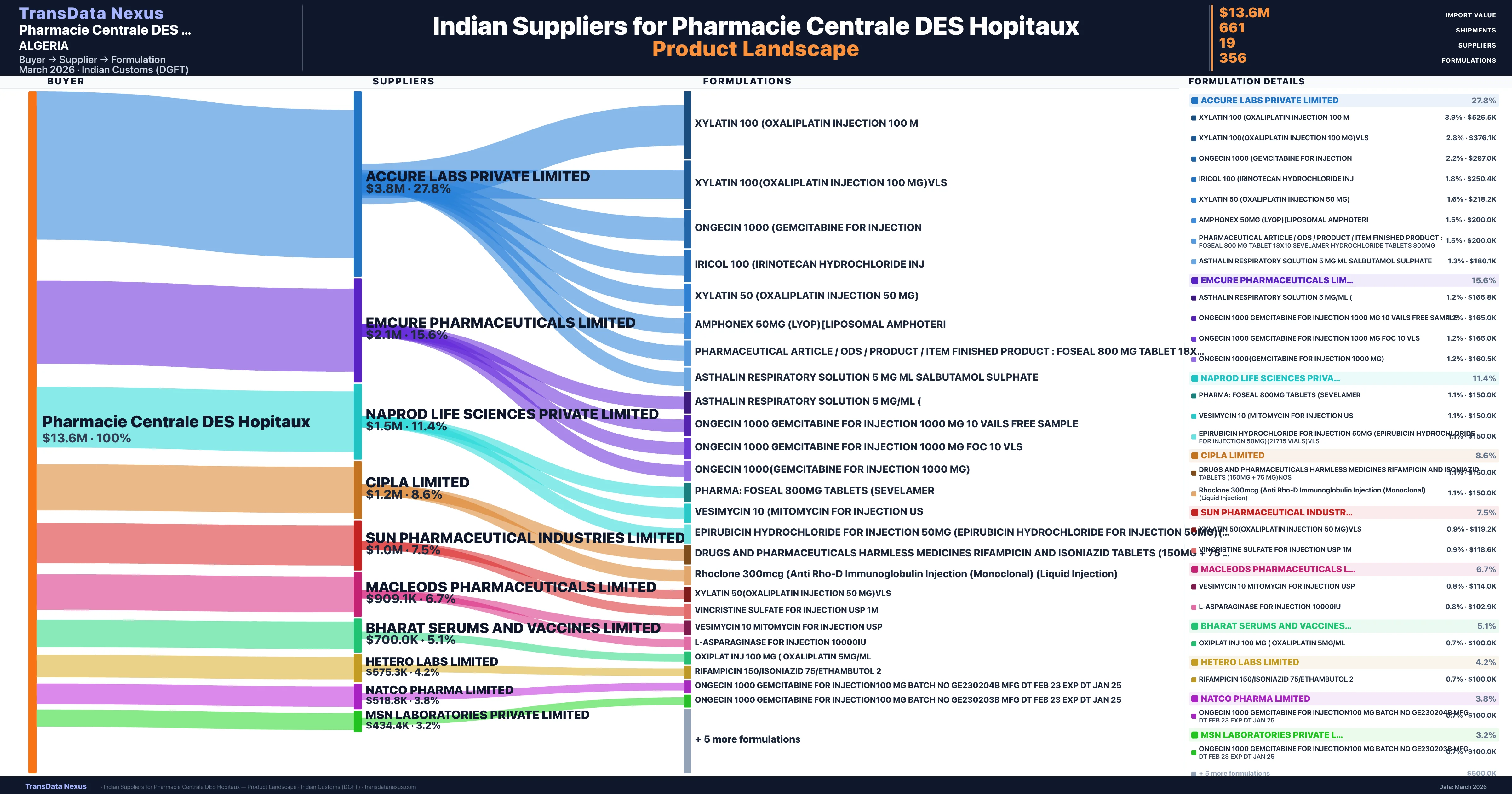 - 5.Supplier Verification: Pharmacie Centrale DES Hopitaux sources from 19 verified Indian suppliers across 356 formulations, confirmed from customs records.