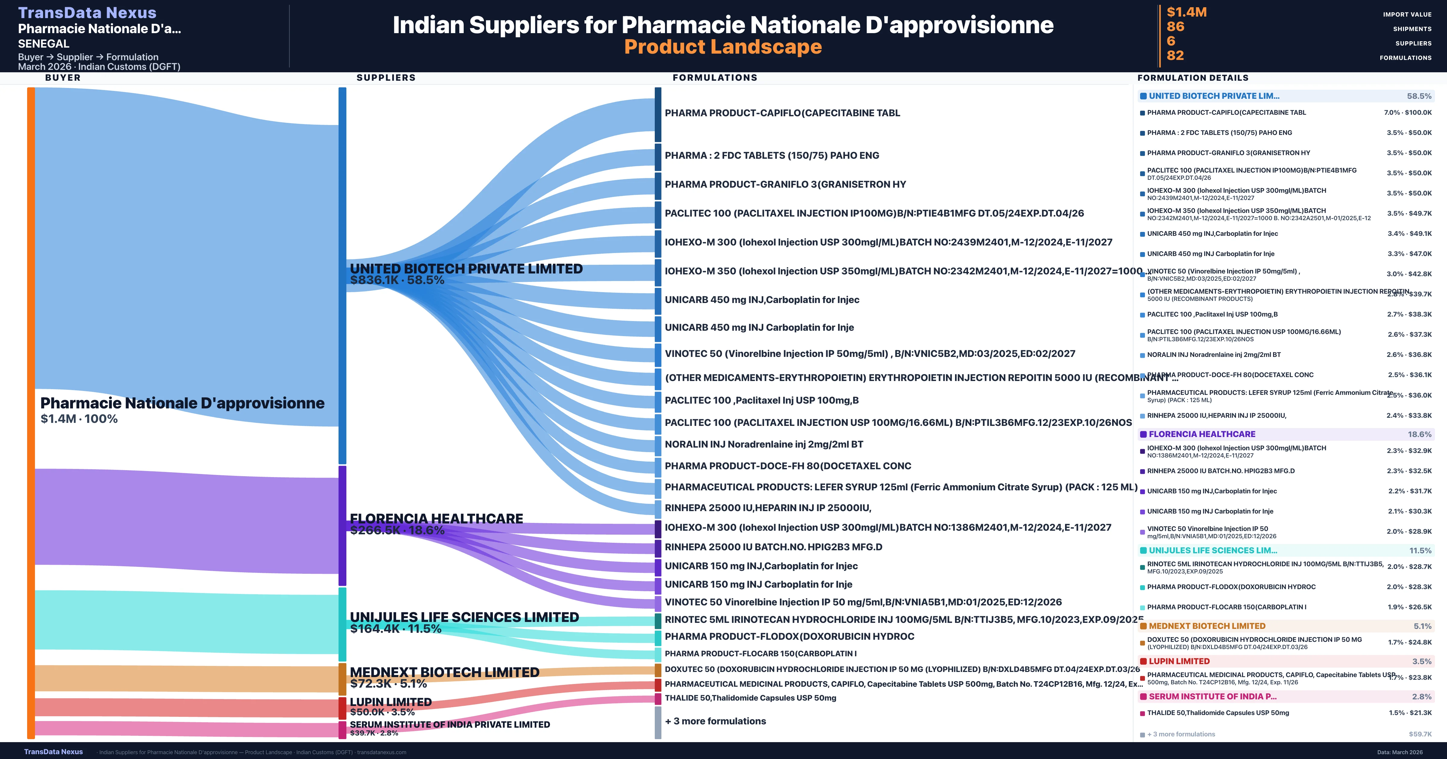 Pharmacie Nationale D'approvisionne is a pharmaceutical importer based in Senegal with a total trade value of $130.2K across 2 products in 1 therapeutic categories. Based on 6 verified import shipments from Indian Customs (DGFT) records, the company actively imports across multiple product segments. Pharmacie Nationale D'approvisionne sources from 6 verified Indian suppliers, with United Biotech Private Limited accounting for 58.5% of imports.