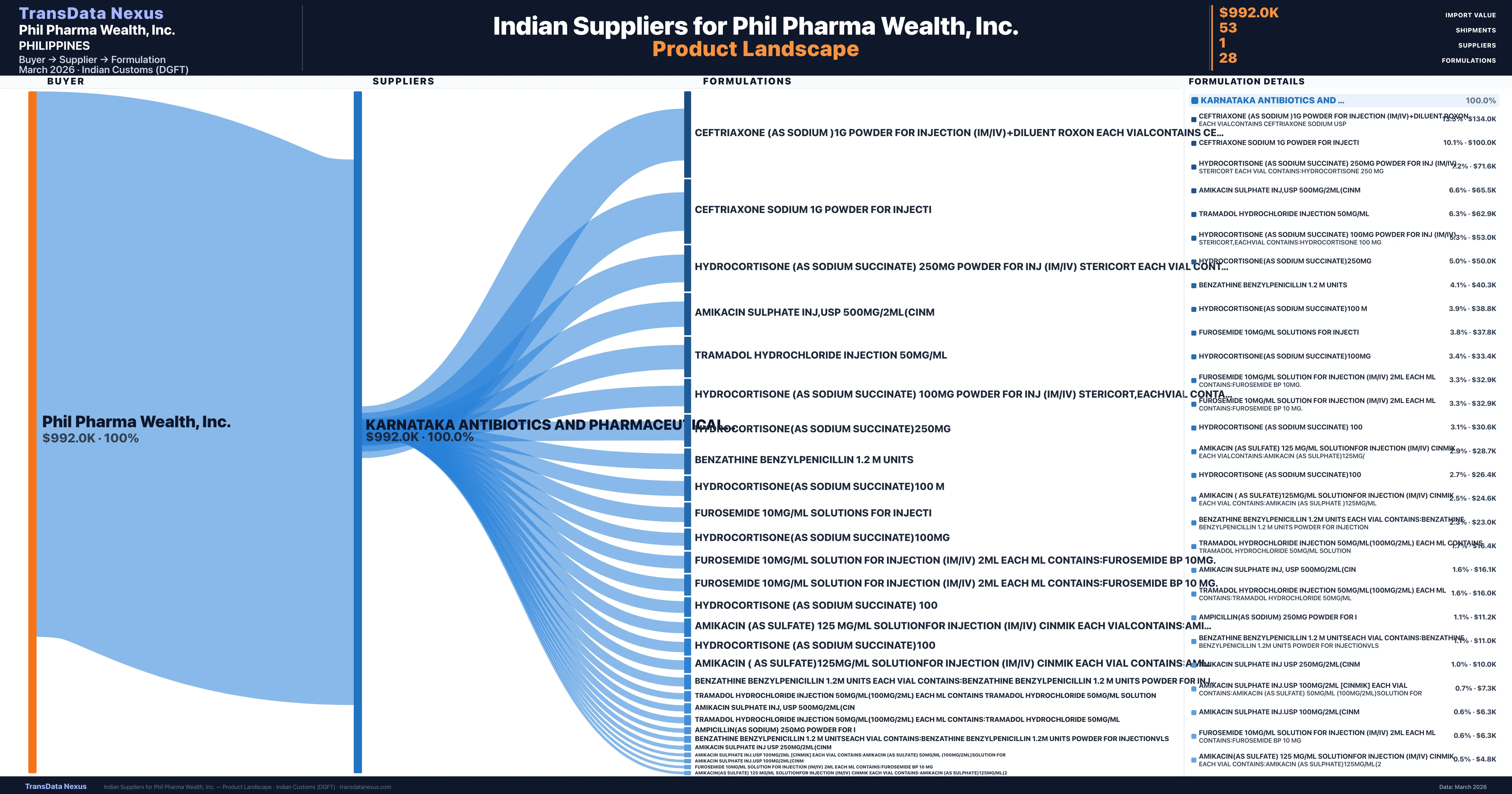 Phil Pharma Wealth, Inc. sources from 1 verified Indian supplier across 28 distinct formulations. The sourcing is highly concentrated — Karnataka Antibiotics And Pharmaceuticals Limited accounts for 100.0% of total imports, indicating a strategic single-source relationship.
