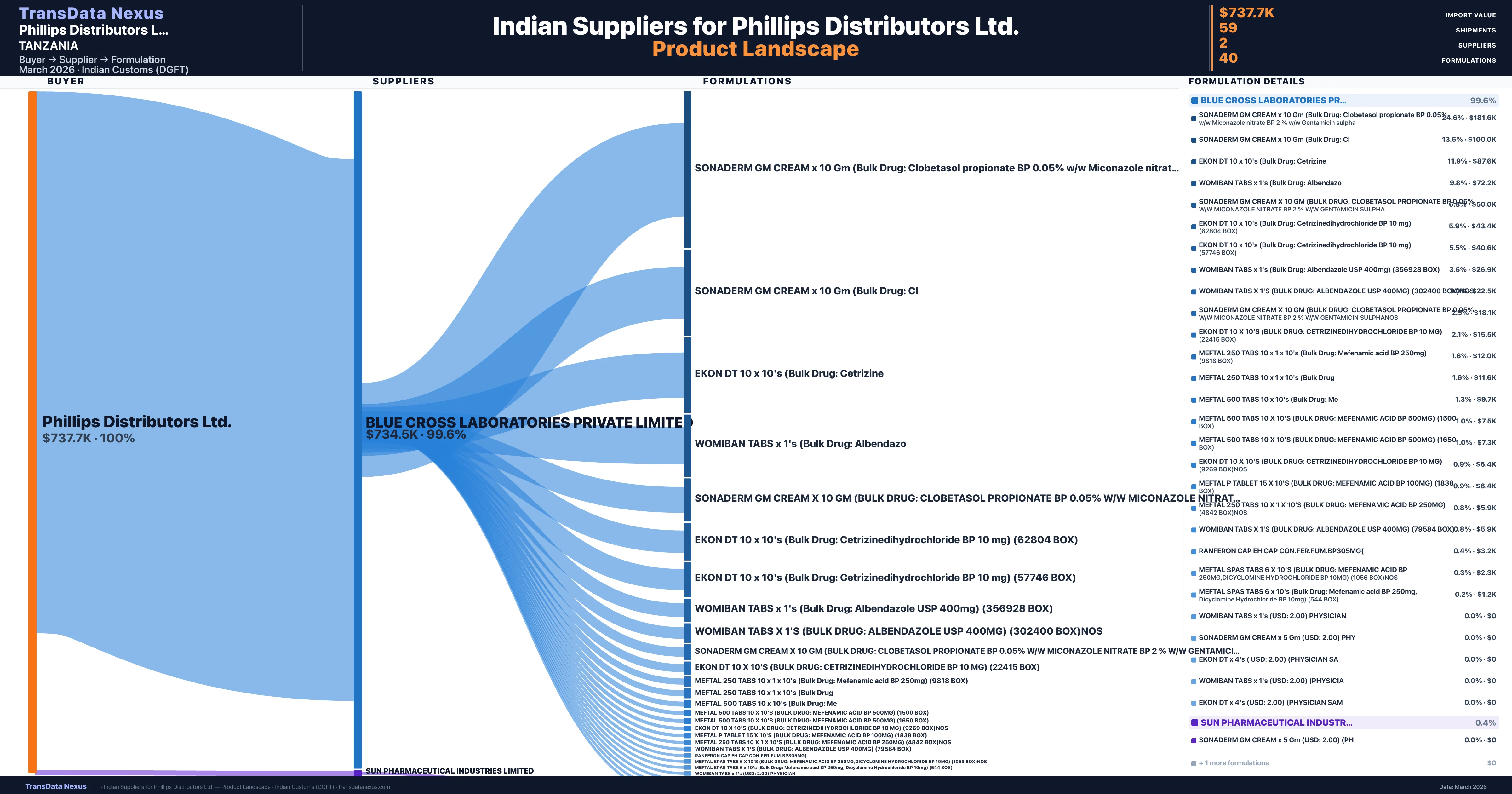 Phillips Distributors Ltd. is a pharmaceutical importer based in Tanzania with a total trade value of $800.0K across 2 products in 2 therapeutic categories. Based on 16 verified import shipments from Indian Customs (DGFT) records, the company actively imports across multiple product segments. Phillips Distributors Ltd. sources from 2 verified Indian suppliers, with Blue Cross Laboratories Private Limited accounting for 99.6% of imports.