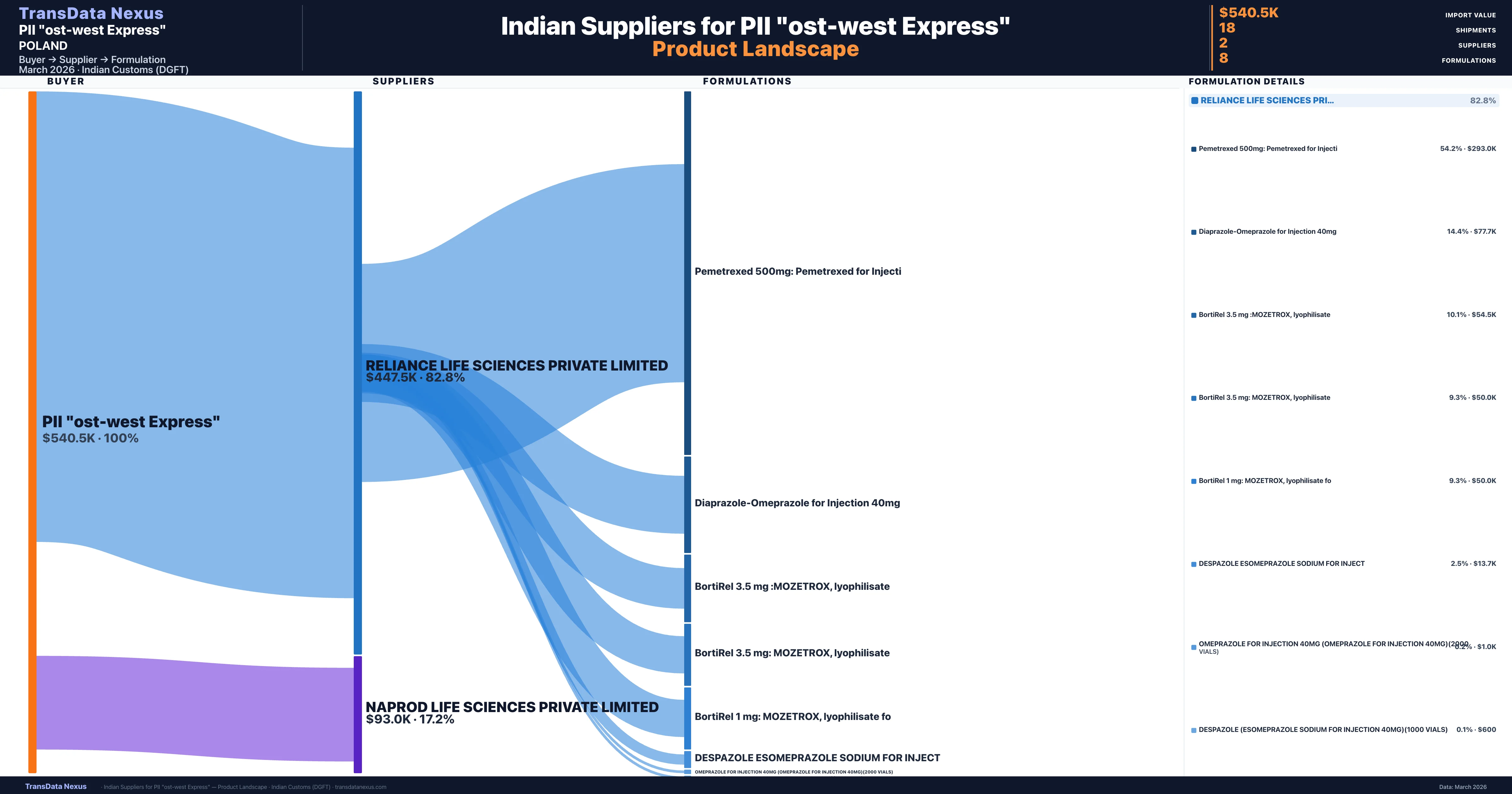 PII "ost-west Express" is a pharmaceutical importer based in Poland with a total trade value of $1.1M across 2 products in 1 therapeutic categories. Based on 21 verified import shipments from Indian Customs (DGFT) records, the company actively imports across multiple product segments. PII "ost-west Express" sources from 2 verified Indian suppliers, with Reliance Life Sciences Private Limited accounting for 82.8% of imports.