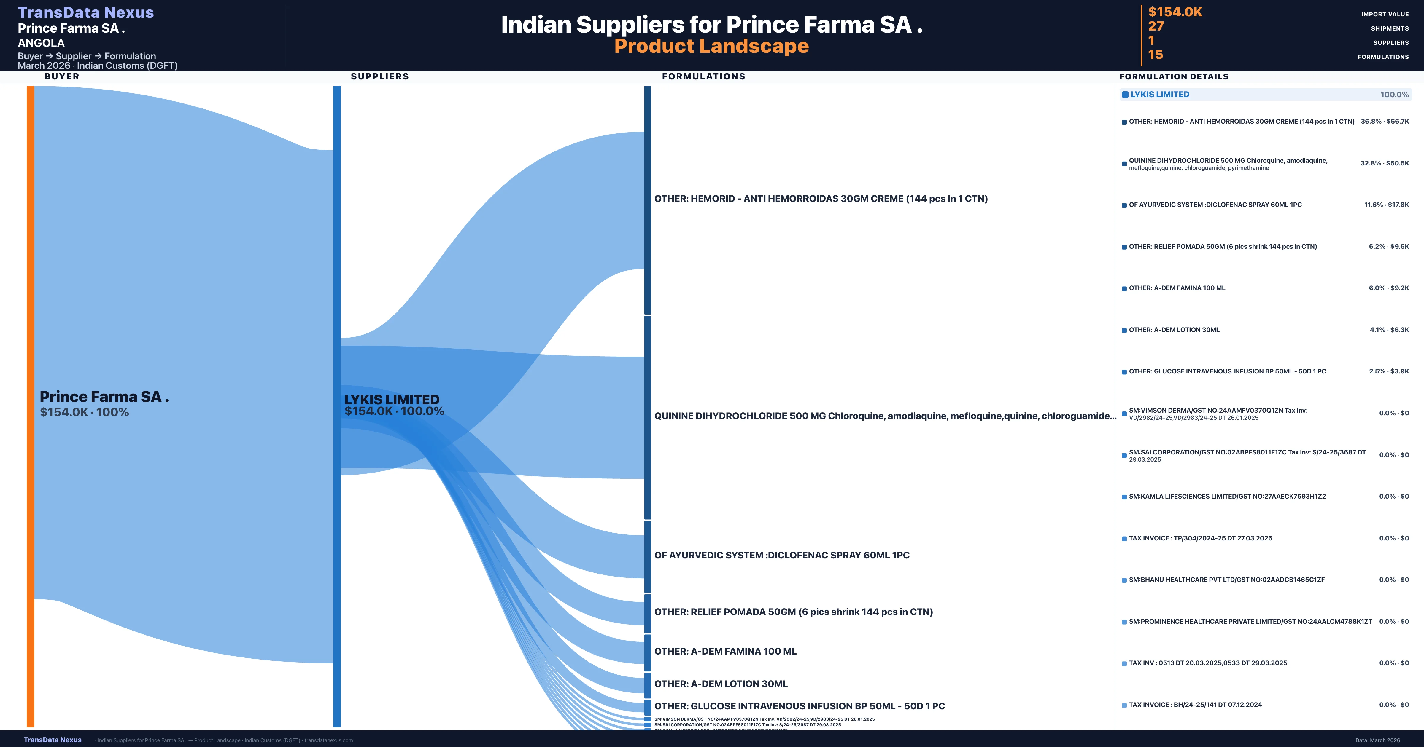 Prince Farma SA . sources from 1 verified Indian supplier across 15 distinct formulations. The sourcing is highly concentrated — Lykis Limited accounts for 100.0% of total imports, indicating a strategic single-source relationship.