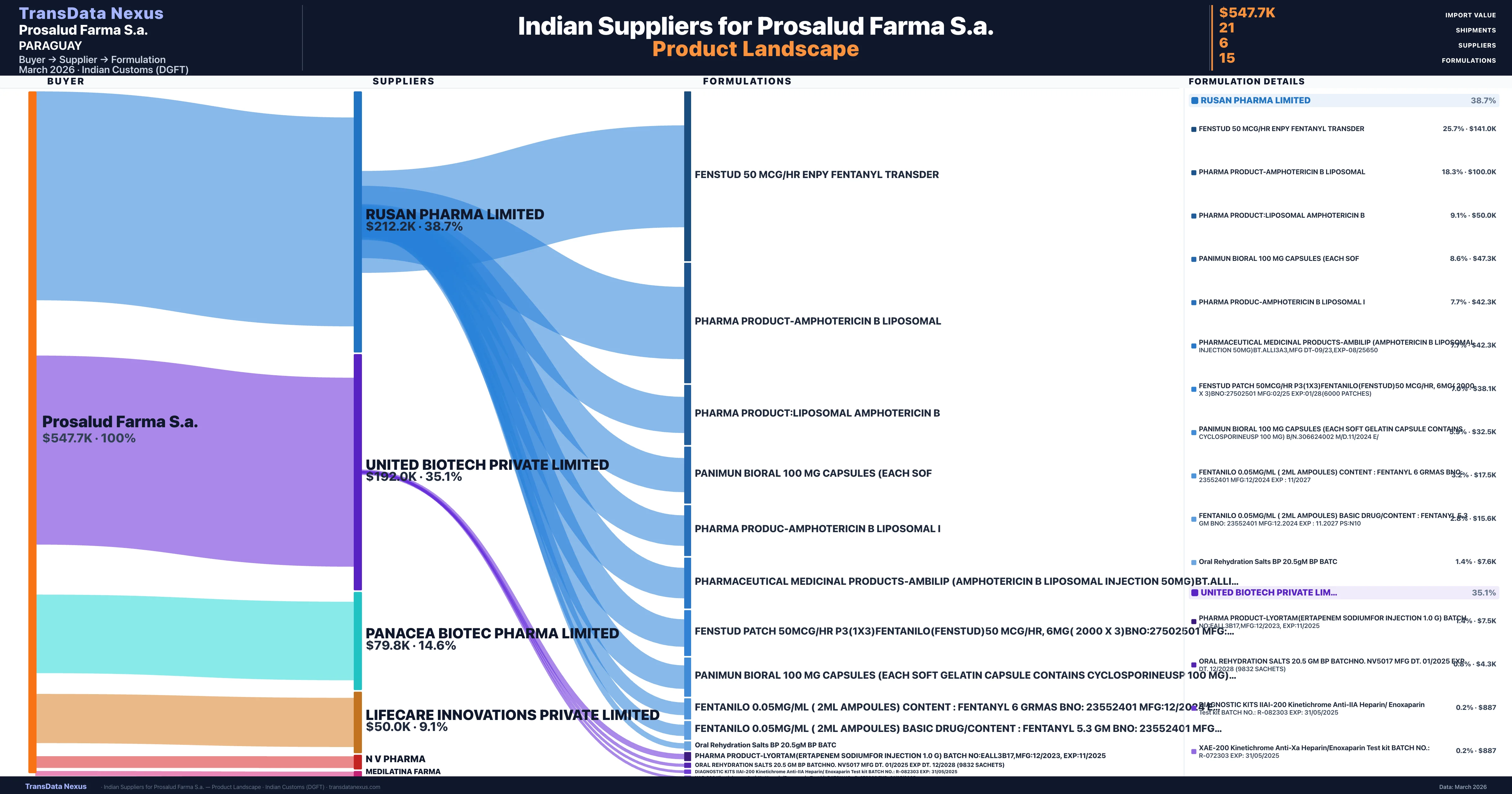 Prosalud Farma S.a. is a pharmaceutical importer based in Paraguay with a total trade value of $324.1K across 2 products in 2 therapeutic categories. Based on 9 verified import shipments from Indian Customs (DGFT) records, the company actively imports across multiple product segments. Prosalud Farma S.a. sources from 6 verified Indian suppliers, with Rusan Pharma Limited accounting for 38.7% of imports.