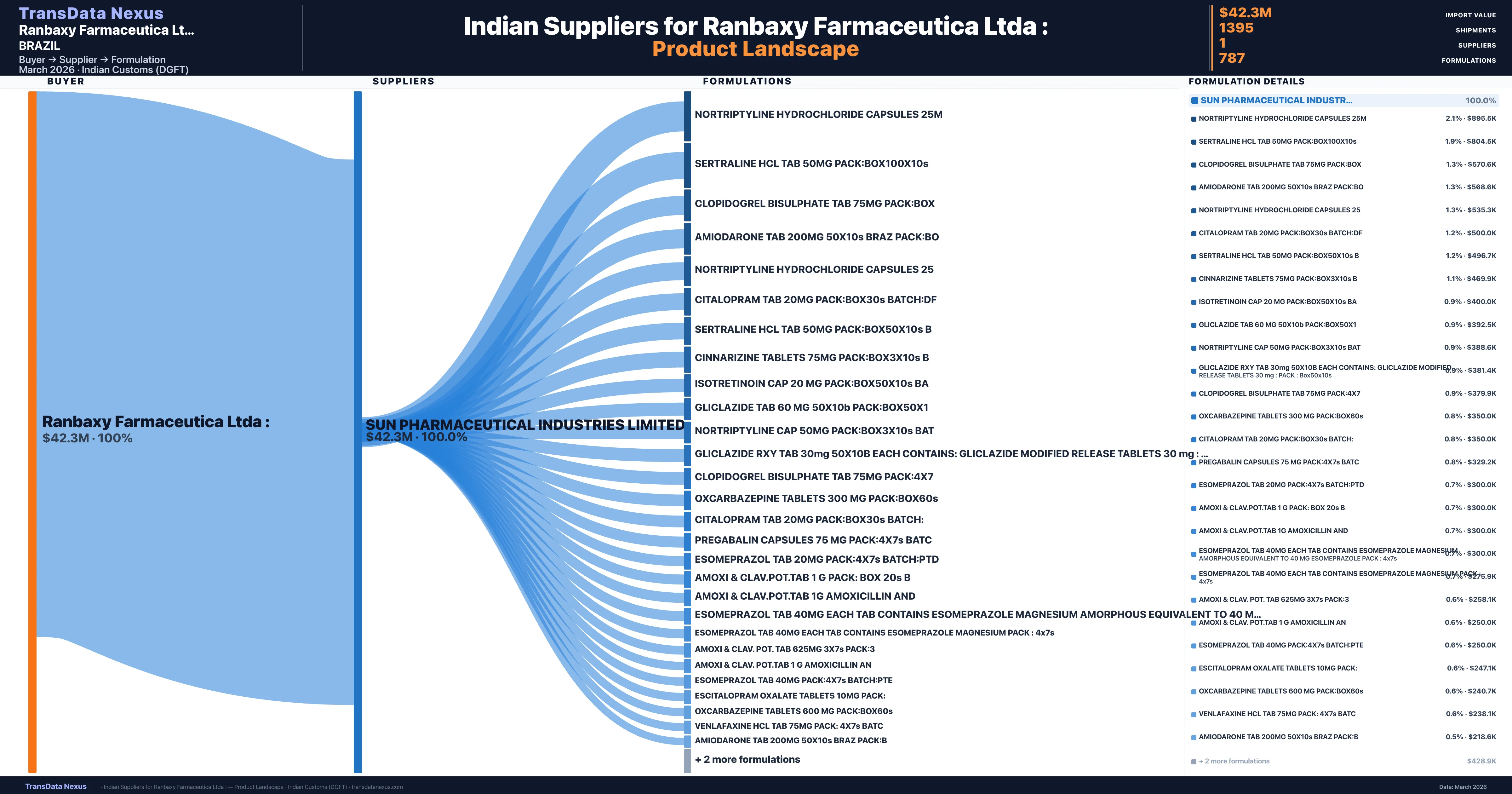Ranbaxy Farmaceutica Ltda : sources from 1 verified Indian supplier across 787 distinct formulations. The sourcing is highly concentrated — Sun Pharmaceutical Industries Limited accounts for 100.0% of total imports, indicating a strategic single-source relationship.