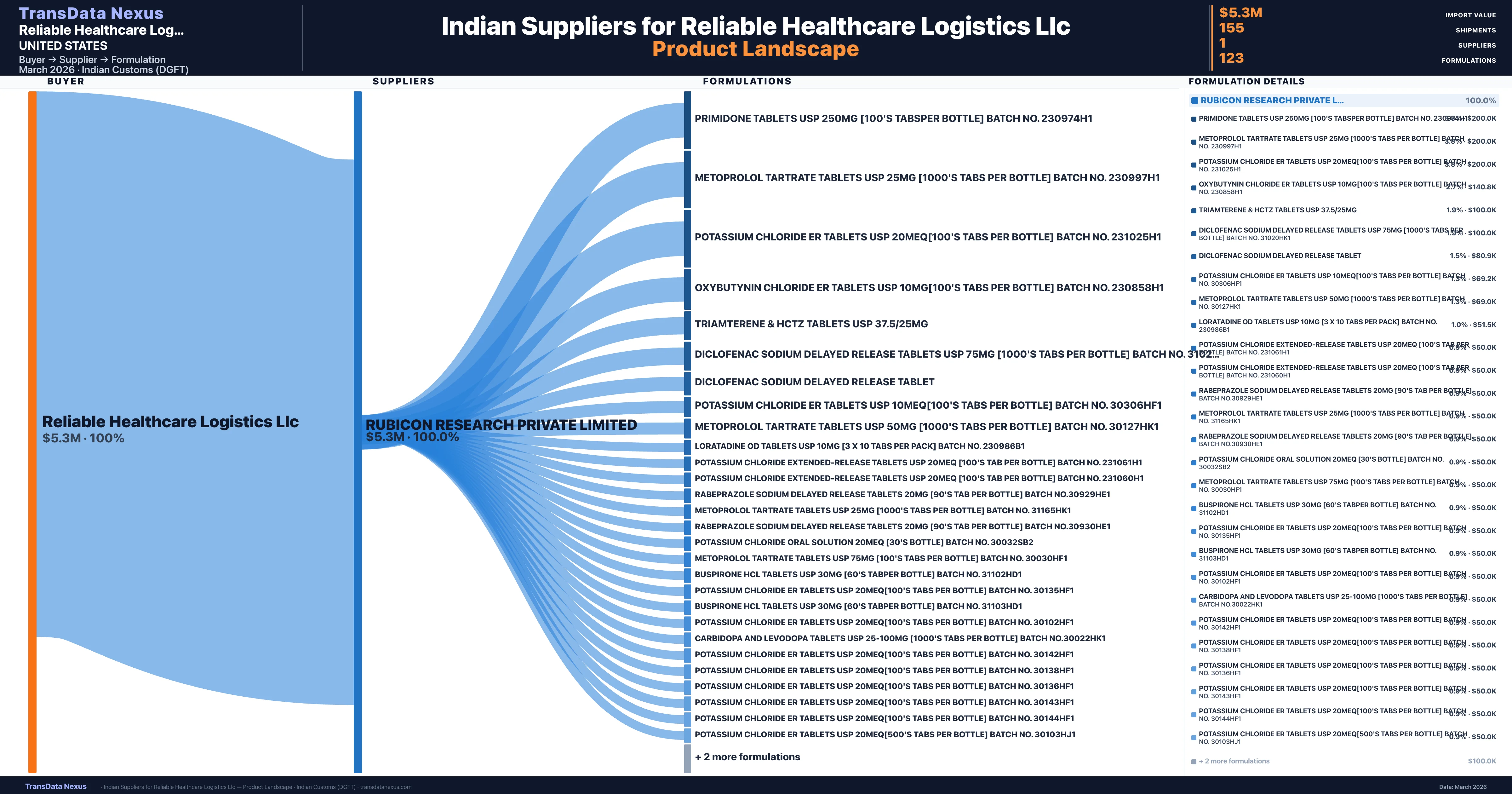 - 5.Supplier Verification: Reliable Healthcare Logistics Llc sources from 1 verified Indian suppliers across 123 formulations, confirmed from customs records.