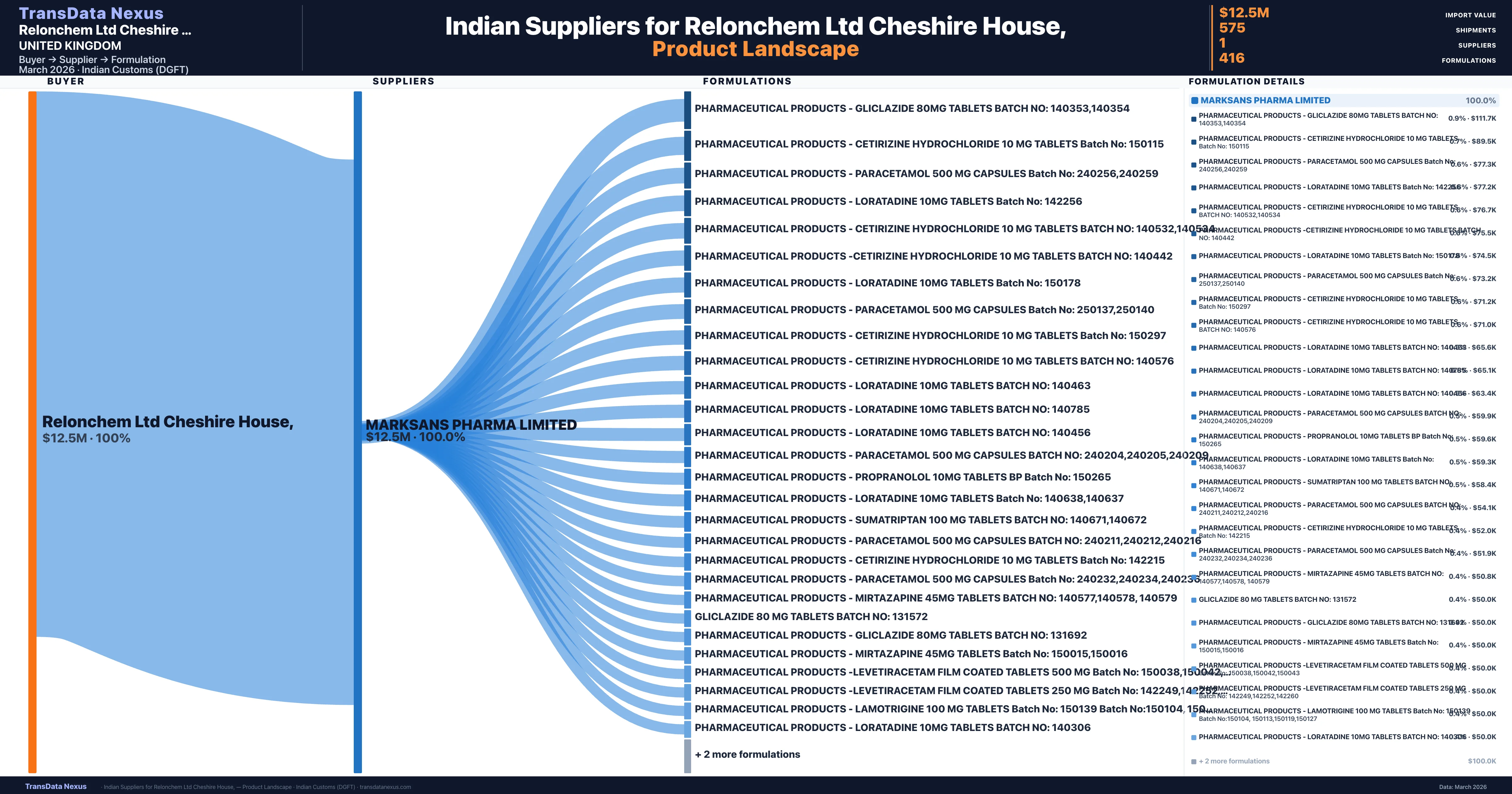 Relonchem Ltd Cheshire House, sources from 1 verified Indian supplier across 416 distinct formulations. The sourcing is highly concentrated — Marksans Pharma Limited accounts for 100.0% of total imports, indicating a strategic single-source relationship.
