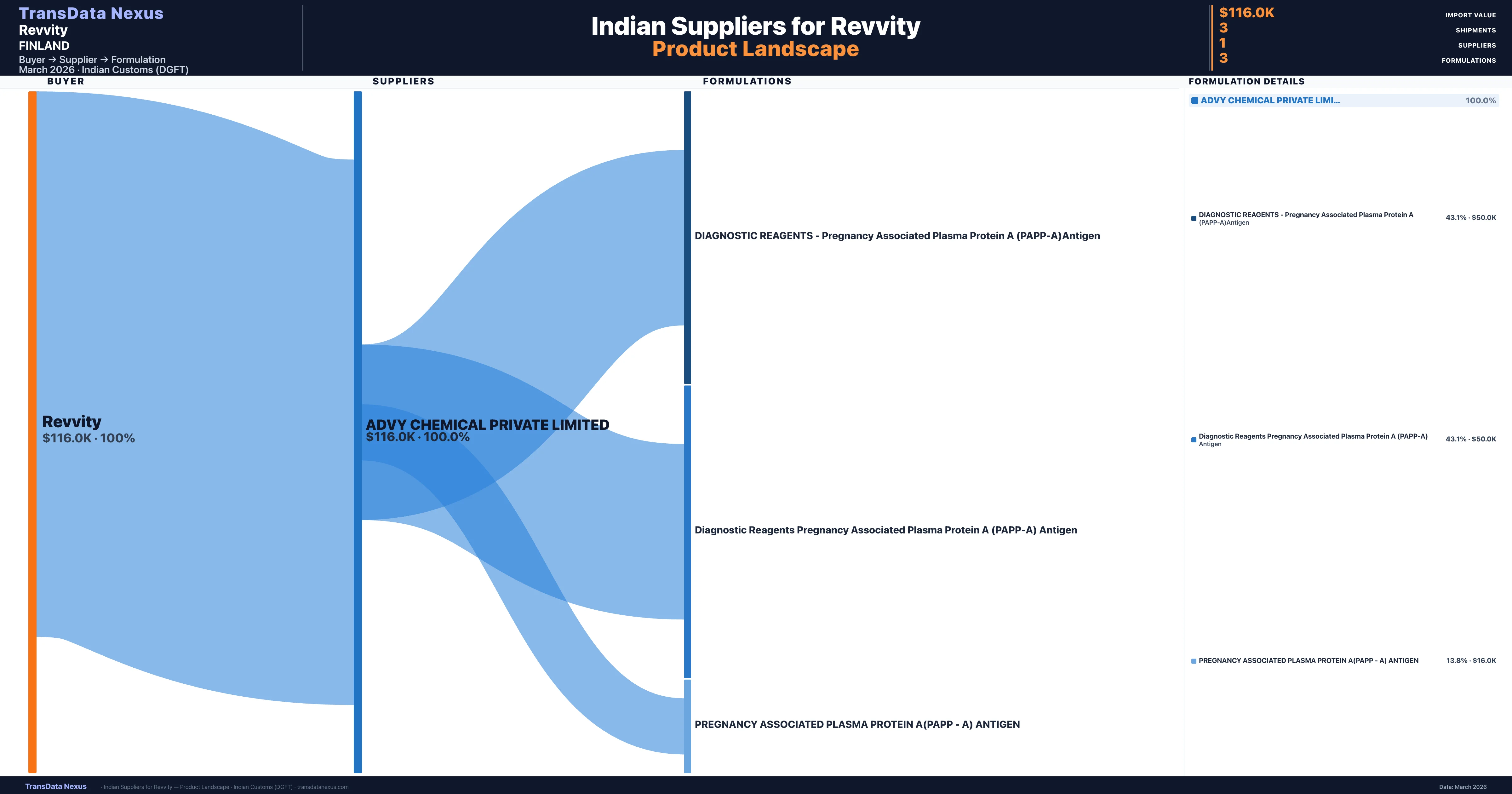 Revvity sources from 1 verified Indian supplier across 3 distinct formulations. The sourcing is highly concentrated β Advy Chemical Private Limited accounts for 100.0% of total imports, indicating a strategic single-source relationship.
