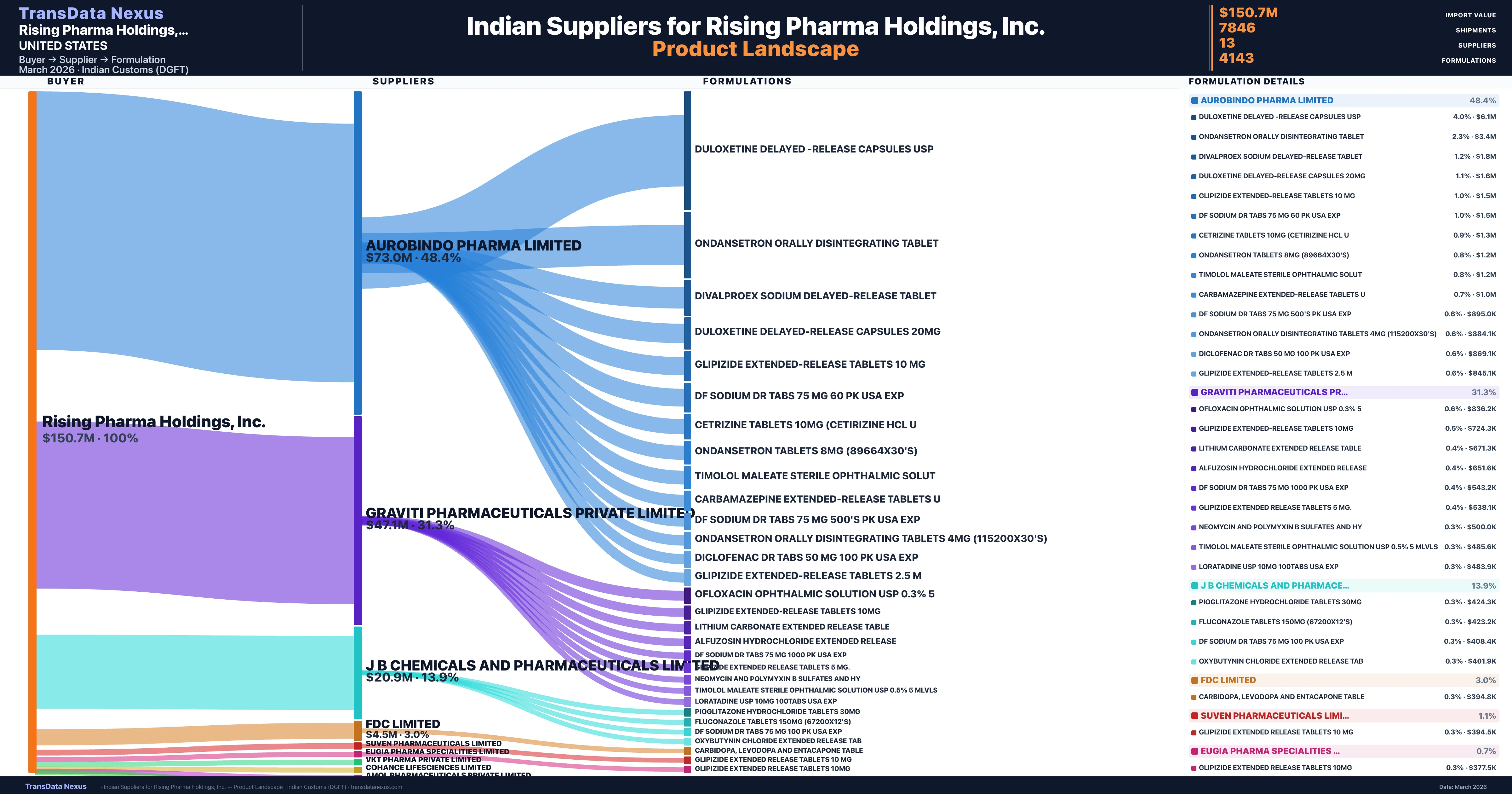 Rising Pharma Holdings, Inc. sources from 13 verified Indian suppliers. The primary supplier is Aurobindo Pharma Limited (48.4% of imports, $73.0M).