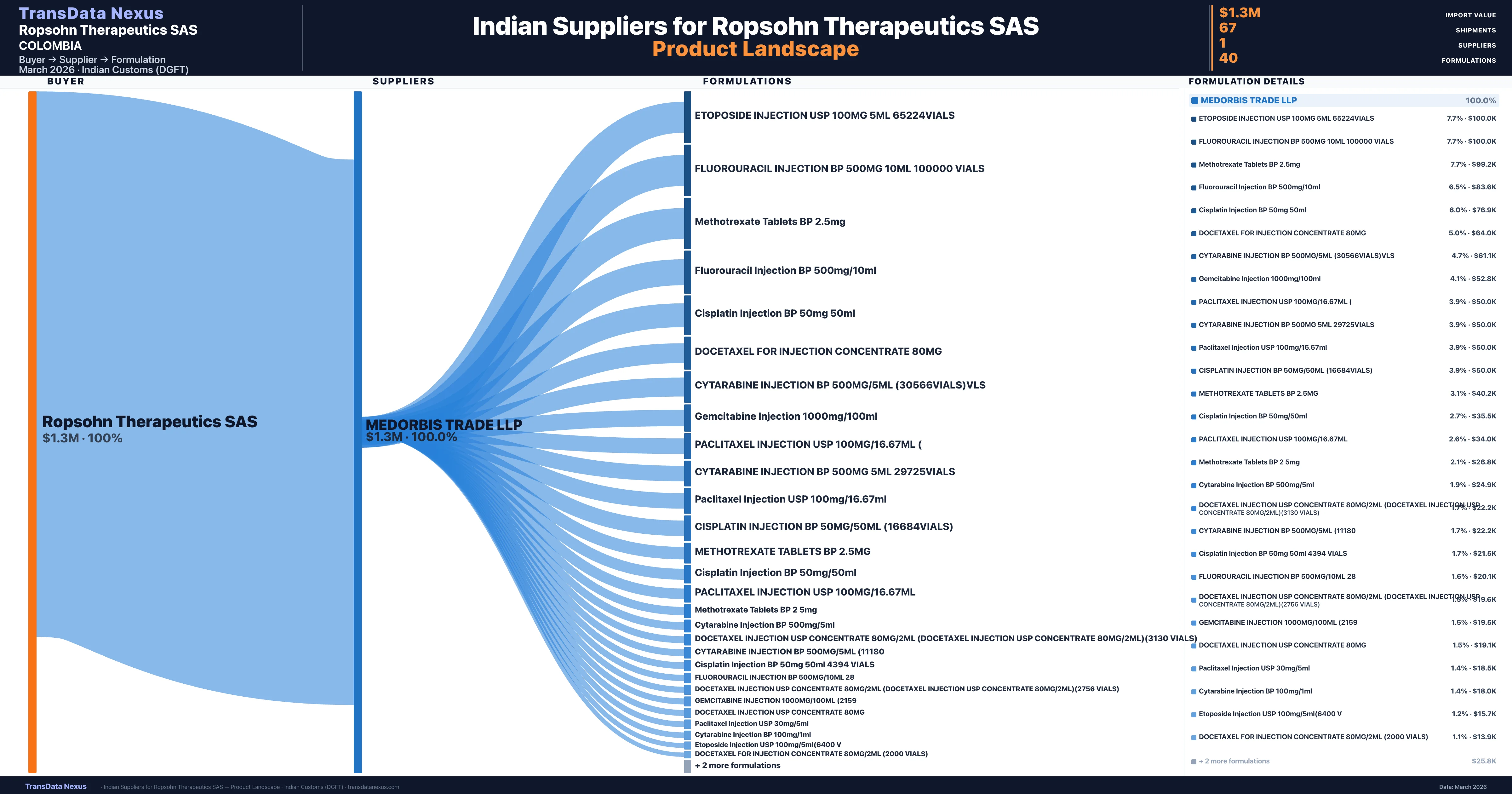Ropsohn Therapeutics SAS sources from 1 verified Indian supplier across 40 distinct formulations. The sourcing is highly concentrated — Medorbis Trade Llp accounts for 100.0% of total imports, indicating a strategic single-source relationship.