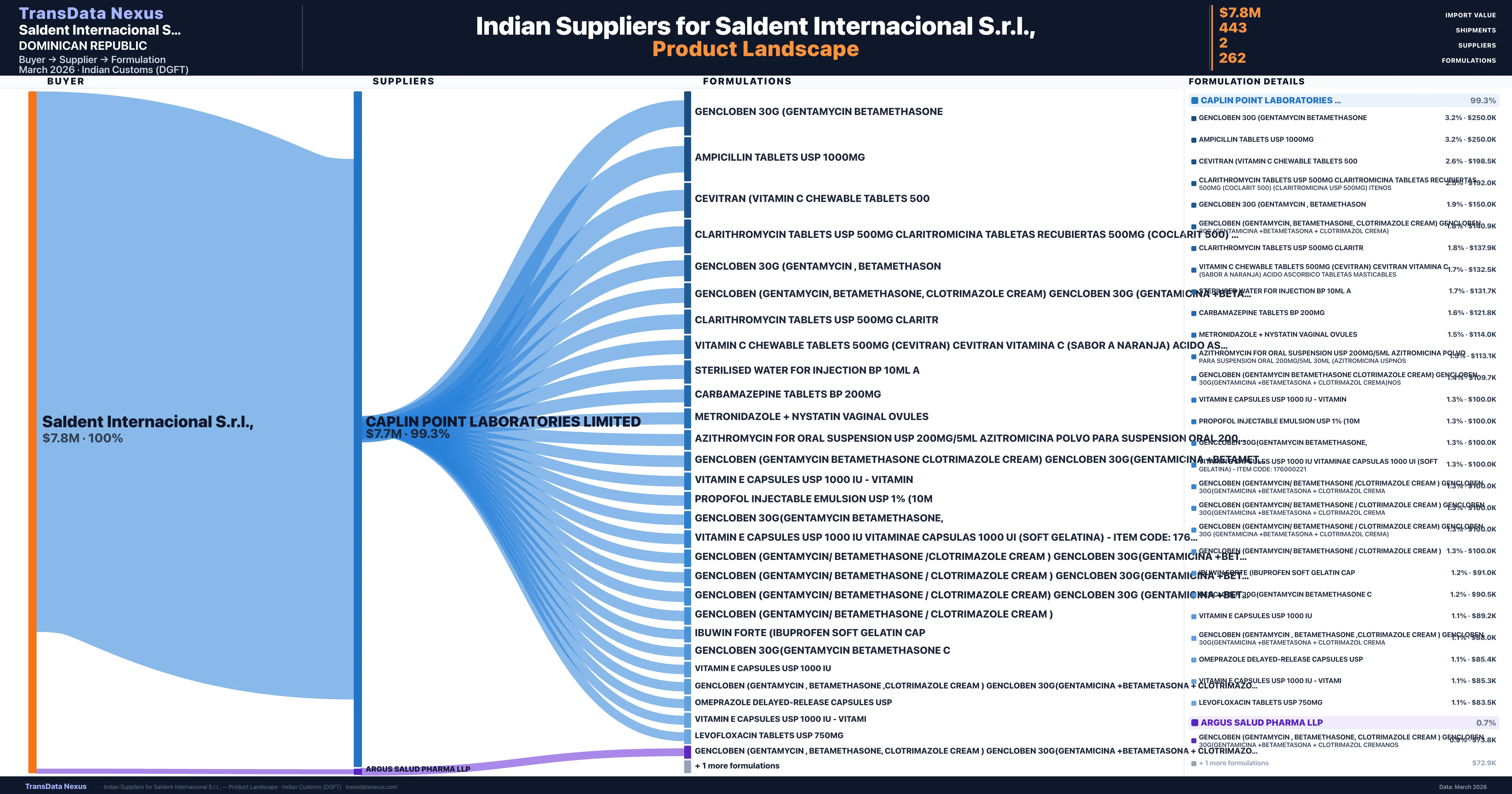 Saldent Internacional S.r.l., sources from 2 verified Indian suppliers across 262 distinct formulations. The sourcing is highly concentrated — Caplin Point Laboratories Limited accounts for 99.3% of total imports, indicating a strategic single-source relationship.