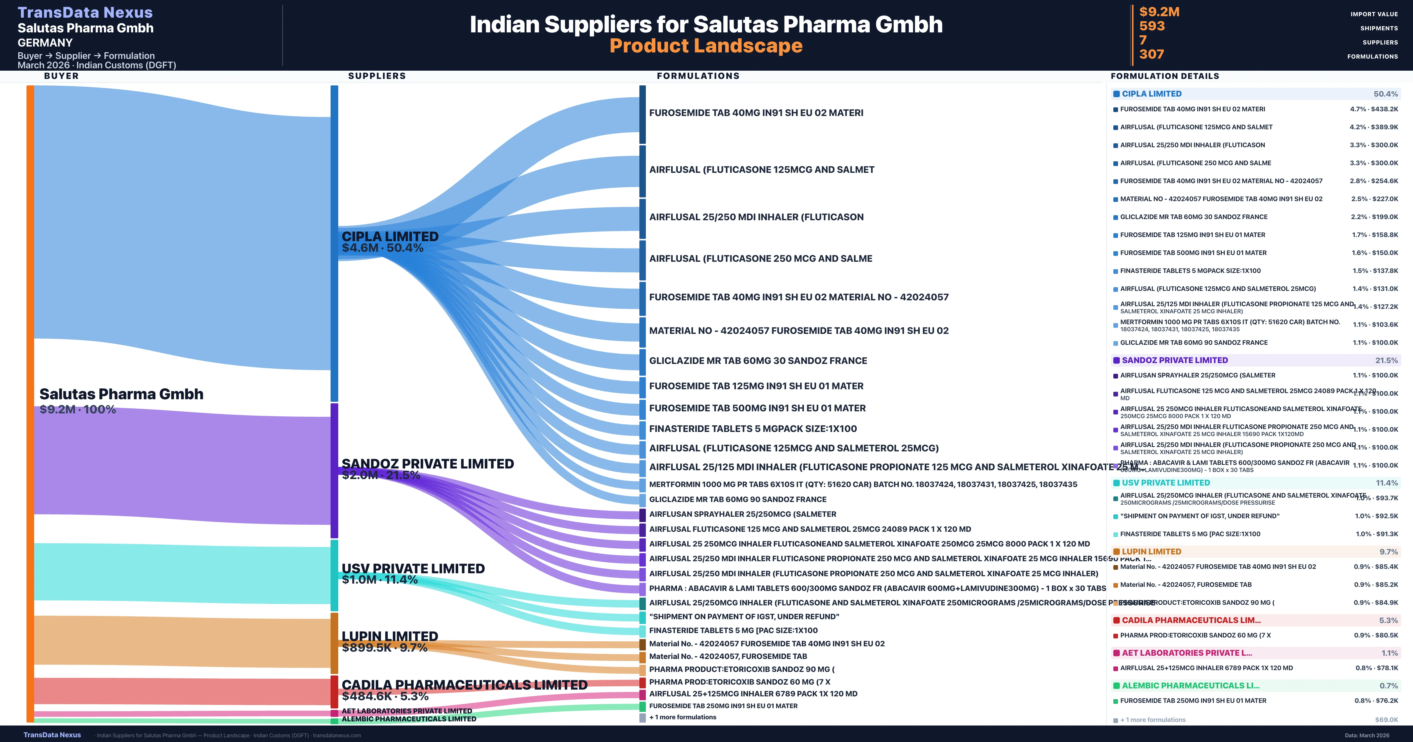 Salutas Pharma Gmbh sources from 7 verified Indian suppliers. The primary supplier is Cipla Limited (50.4% of imports, $4.6M).