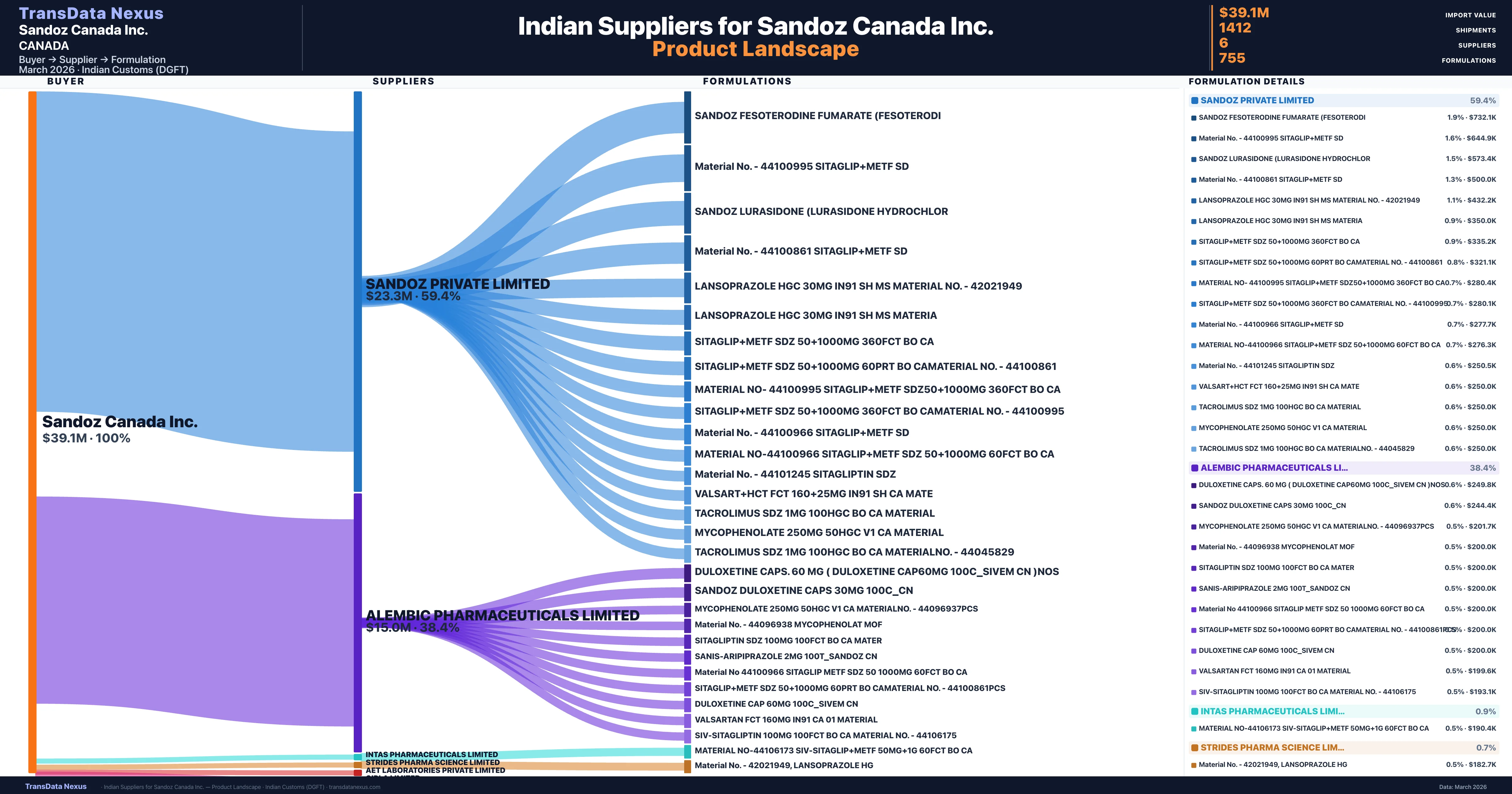 - 5.Supplier Verification: Sandoz Canada Inc. sources from 6 verified Indian suppliers across 755 formulations, confirmed from customs records.