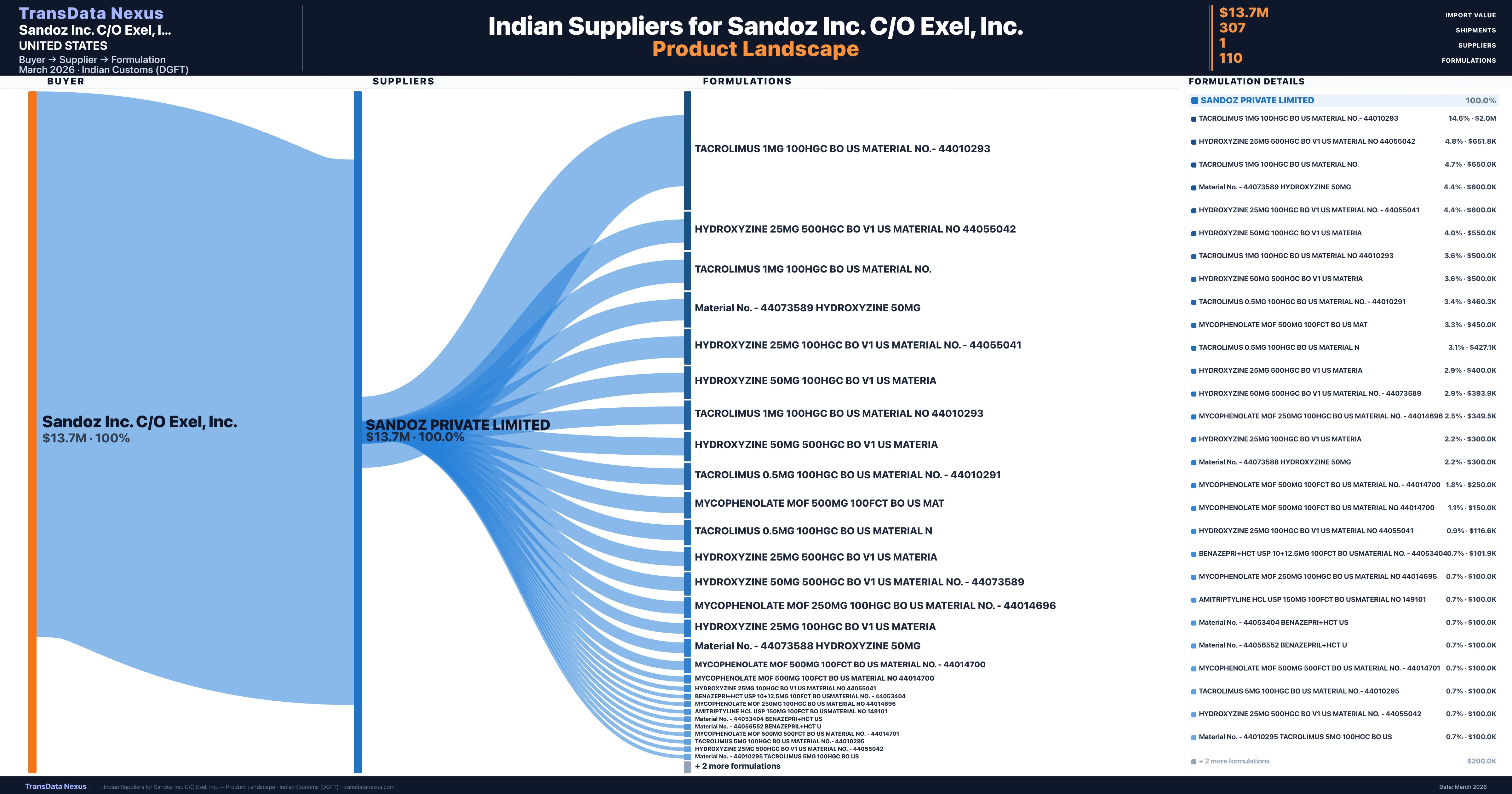 - 5.Supplier Verification: Sandoz Inc. C/O Exel, Inc. sources from 1 verified Indian suppliers across 110 formulations, confirmed from customs records.