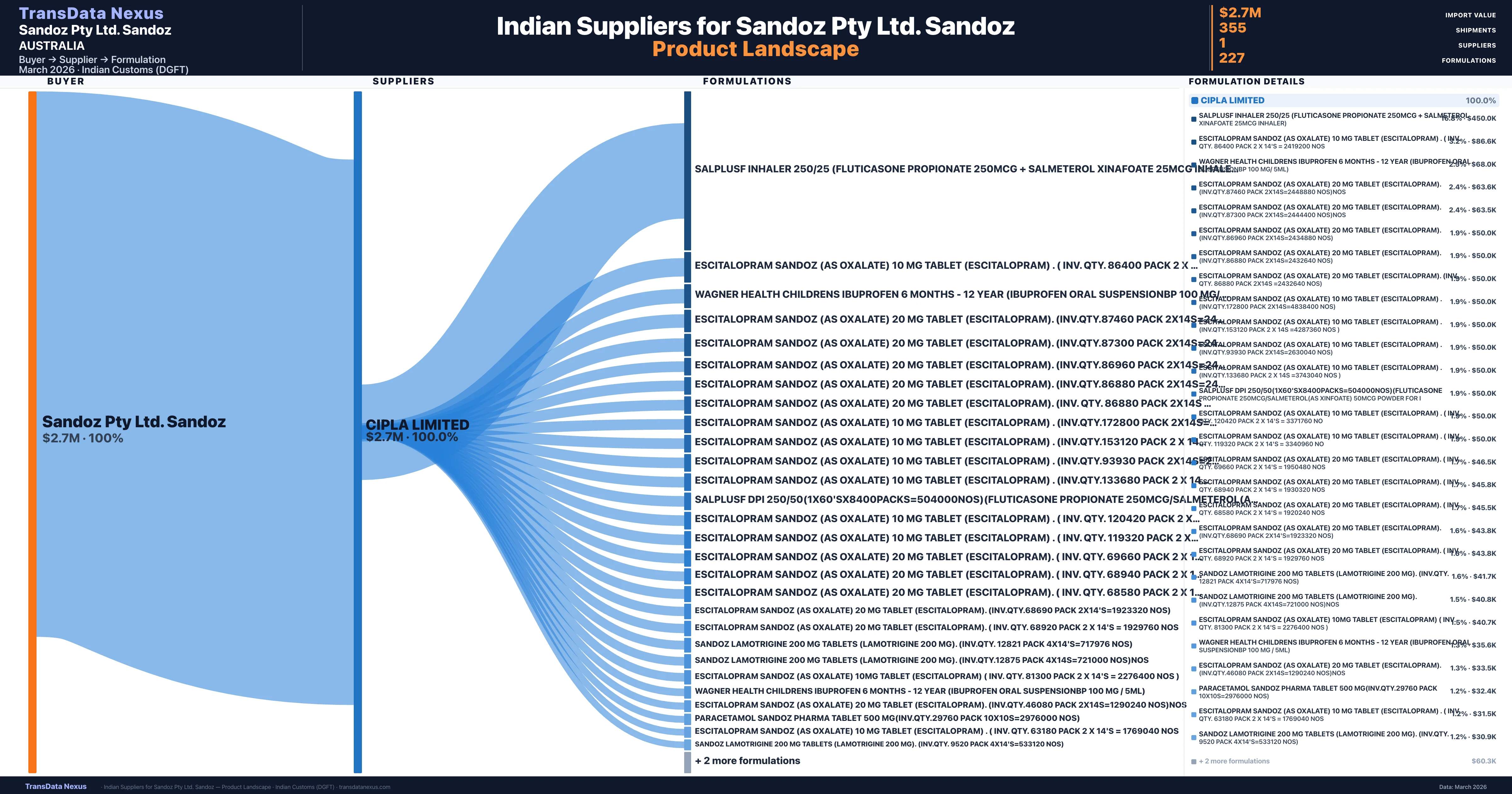 Sandoz Pty Ltd. Sandoz sources from 1 verified Indian supplier across 227 distinct formulations. The sourcing is highly concentrated — Cipla Limited accounts for 100.0% of total imports, indicating a strategic single-source relationship.