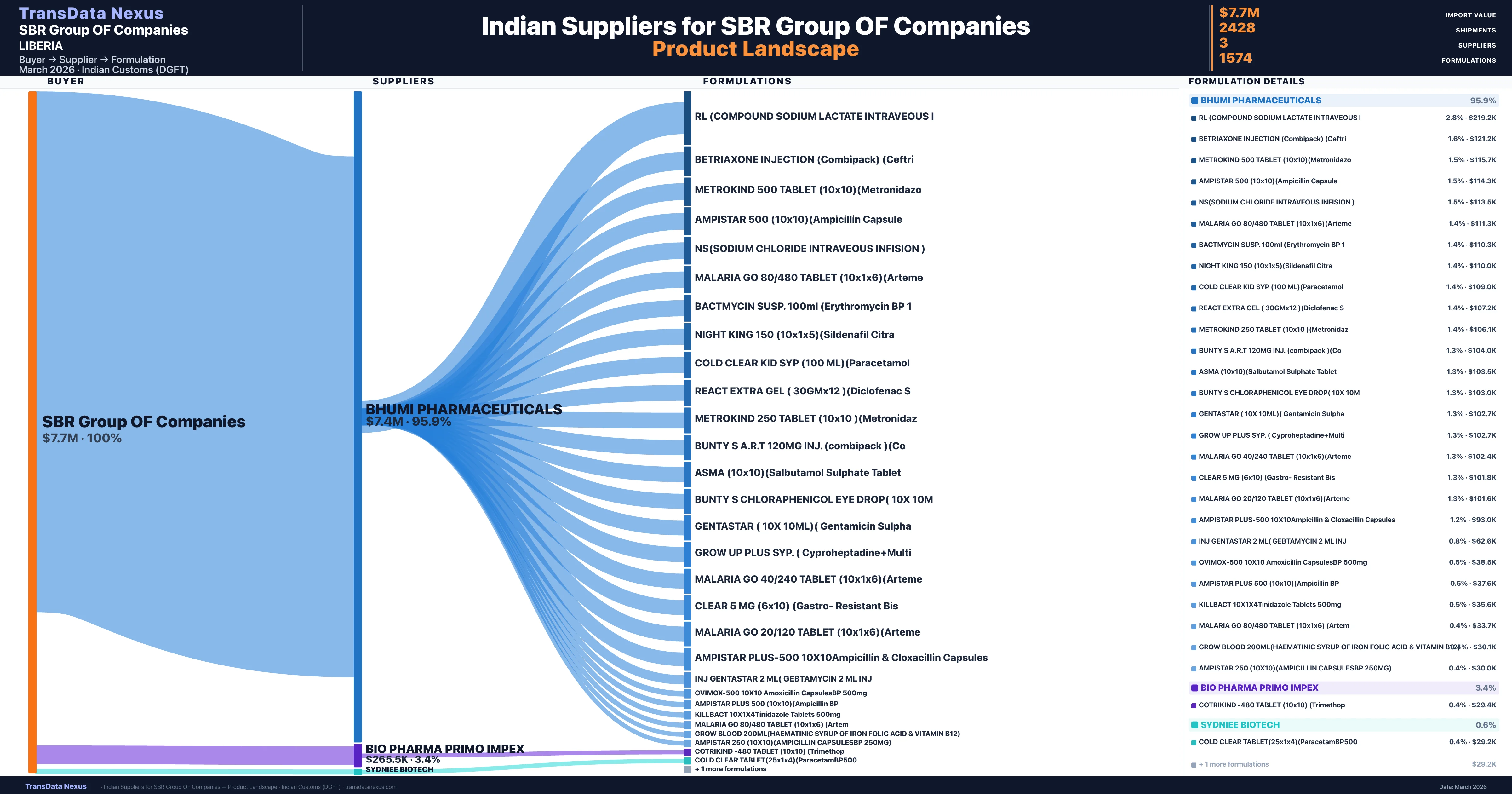 - 5.Supplier Verification: SBR Group OF Companies sources from 3 verified Indian suppliers across 1,574 formulations, confirmed from customs records.