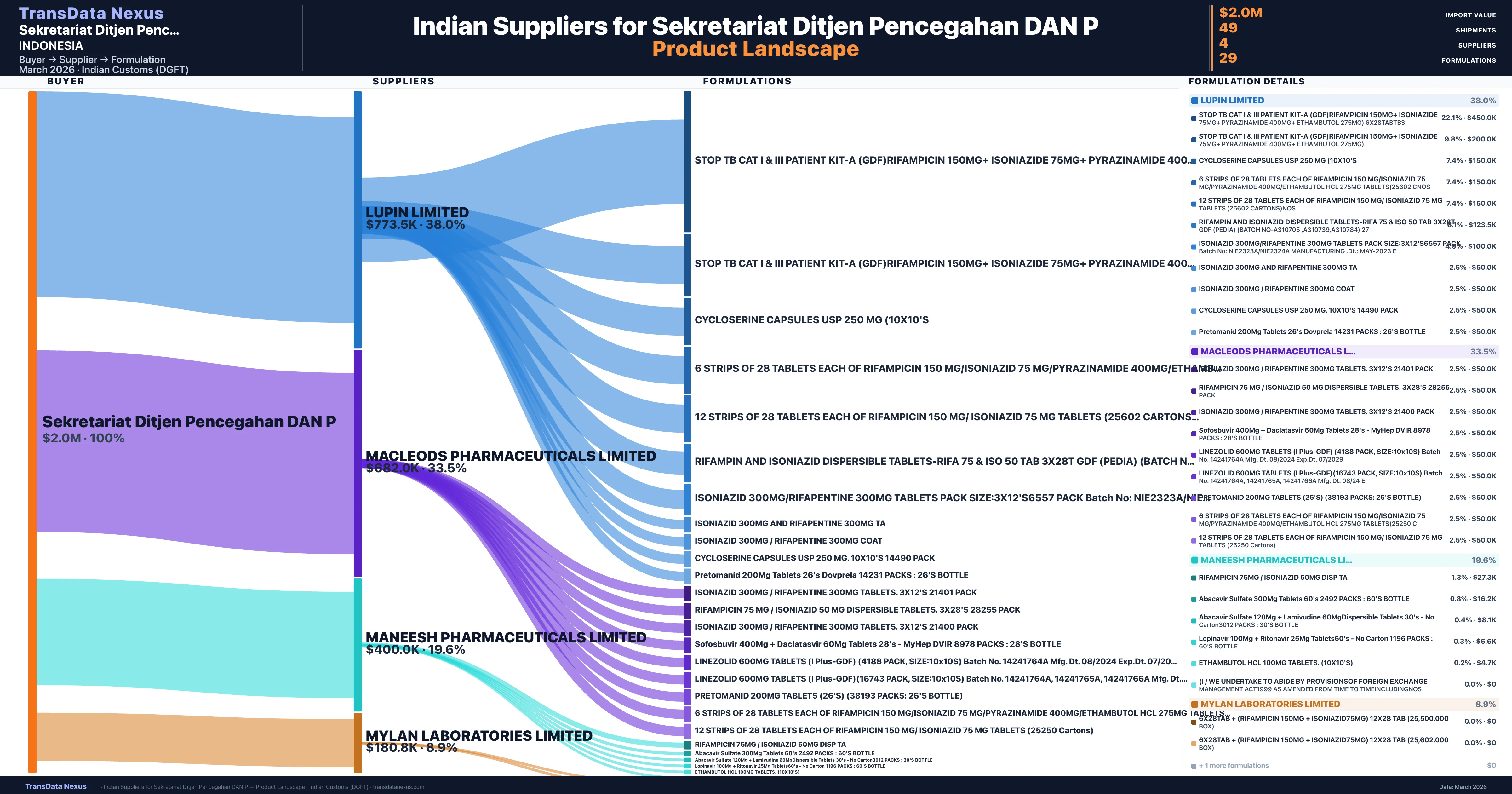 Sekretariat Ditjen Pencegahan DAN P sources from 4 verified Indian suppliers. The primary supplier is Lupin Limited (38.0% of imports, $773.5K).