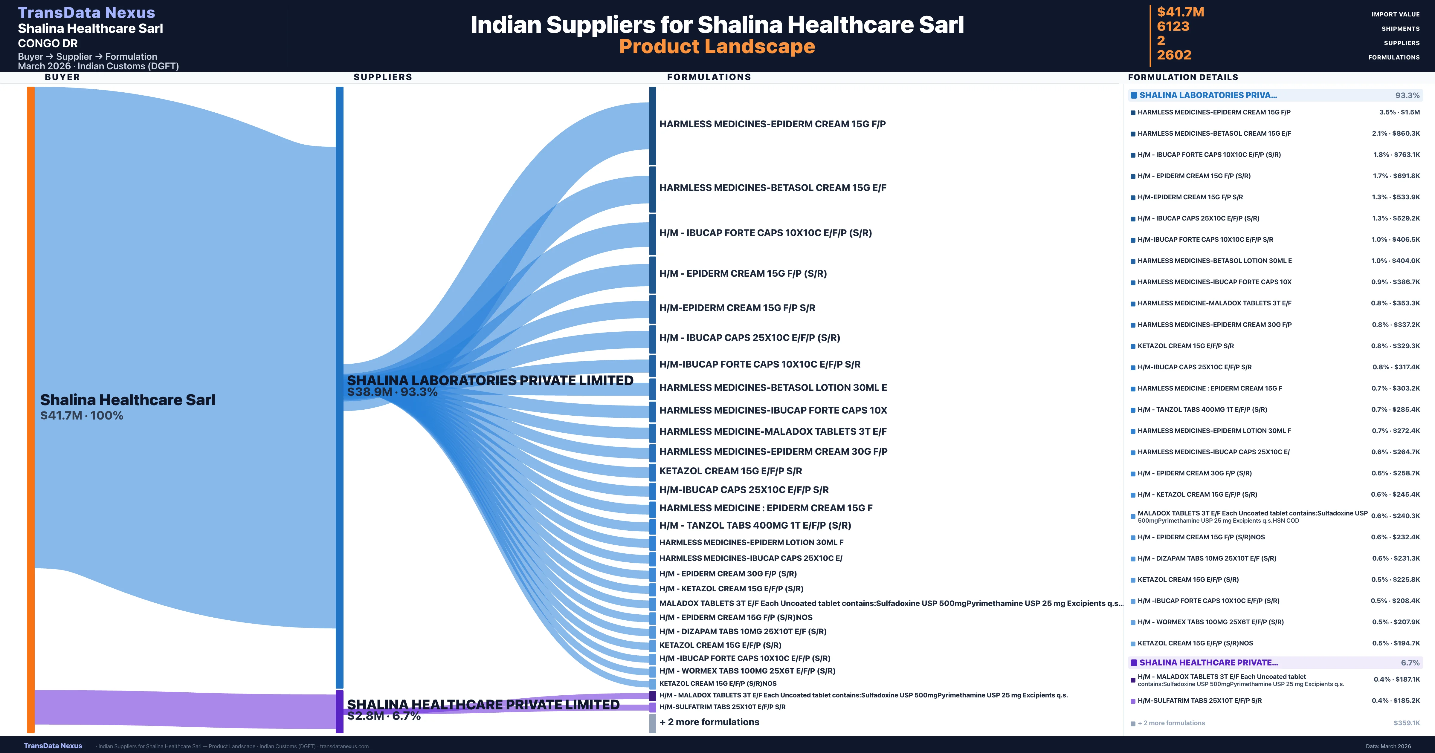 Shalina Healthcare Sarl sources from 2 verified Indian suppliers across 2,602 distinct formulations. The sourcing is β Shalina Laboratories Private Limited accounts for 93.3% of total imports, indicating a strategic single-source relationship.