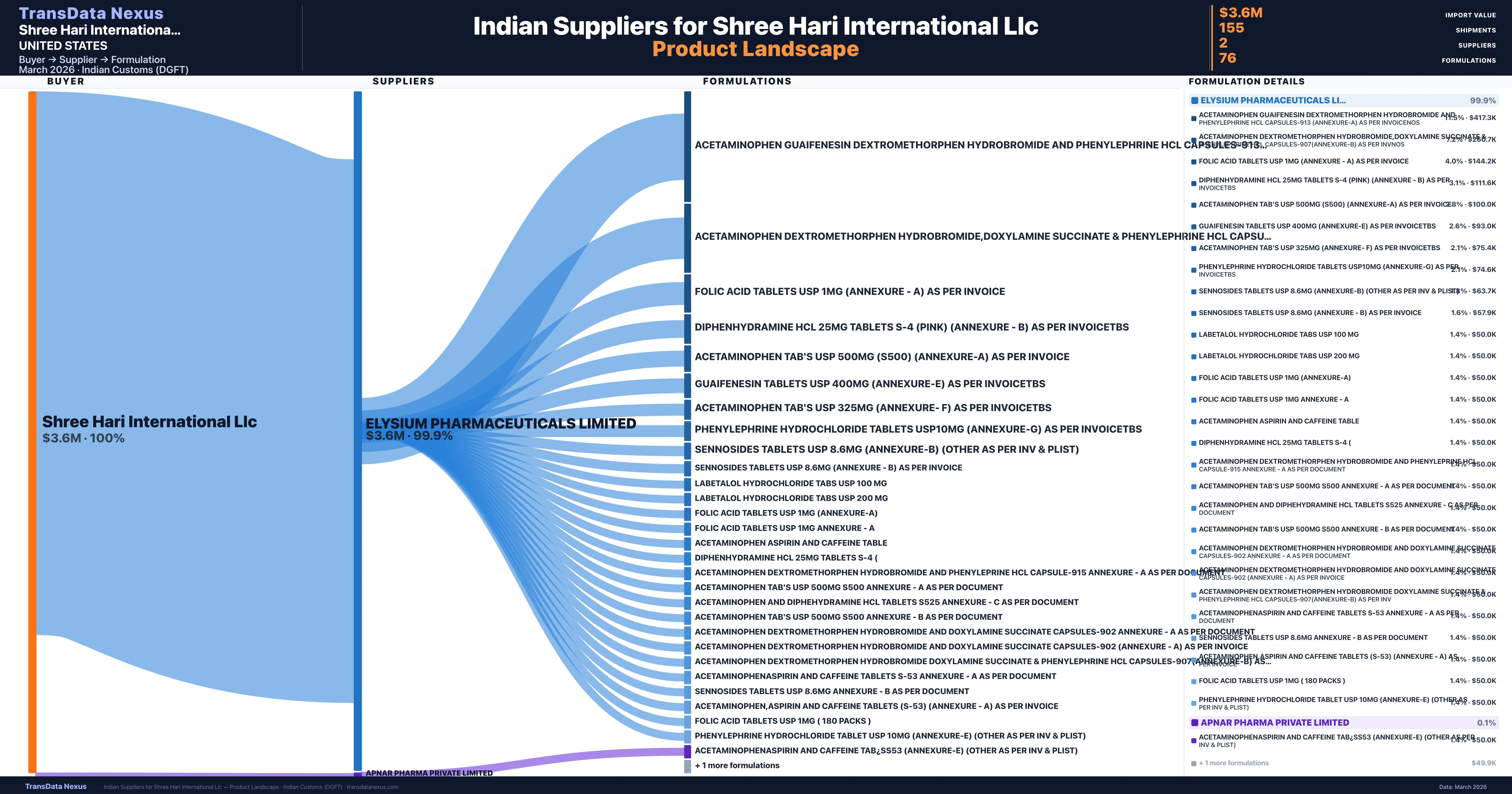 Shree Hari International Llc sources from 2 verified Indian suppliers across 76 distinct formulations. The sourcing is highly concentrated — Elysium Pharmaceuticals Limited accounts for 99.9% of total imports, indicating a strategic single-source relationship.